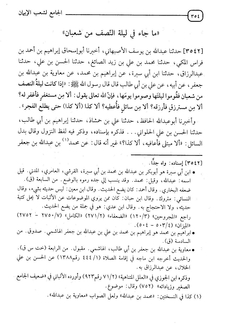 3542 - حَدَّثَنَا عَبْدُ اللهِ بْنُ يُوسُفَ الْأَصْبَهَانِيُّ، أَخْبَرَنَا أَبُو إِسْحَاقَ إِبْرَاهِيمُ بْنُ أَحْمَدَ بْنِ فِرَاسٍ الْمَكِّيُّ، حَدَّثَنَا مُحَمَّدُ بْنُ عَلِيِّ بْنِ زَيْدٍ الصَّائِغُ، حَدَّثَنَا الْحَسَنُ بْنُ عَلِيٍّ حَدَّثَنَا عَبْدُ الرَّزَّاقِ، حَدَّثَنَا ابْنُ أَبِي سَبْرَةَ، عَنْ إِبْرَاهِيمَ بْنِ مُحَمَّدٍ، عَنْ مُعَاوِيَةَ بْنِ عَبْدِ اللهِ بْنِ جَعْفَرٍ، عَنْ أَبِيهِ، عَنْ عَلِيِّ بْنِ أَبِي طَالِبٍ، قَالَ: قَالَ رَسُولُ اللهِ صَلَّى اللَّهُ عَلَيْهِ وَسَلَّمَ: " §إِذَا كَانَتْ لَيْلَةُ النِّصْفِ مِنْ شَعْبَانَ فَقُومُوا لَيْلَتَهَا، وَصُومُوا يَوْمَهَا، فَإِنَّ اللهَ تَعَالَى يَقُولُ: أَلَا مِنْ مُسْتَغْفِرٍ فَأَغْفِرَ لَهُ، أَلَا مِنْ مُسْتَرْزِقٍ فَأَرْزُقَهُ، أَلَا مِنْ سَائِلٍ فَأُعْطِيَهُ، أَلَا كَذَا أَلَا كَذَا حَتَّى يَطْلُعَ الْفَجْرُ ". وأَخْبَرَنَا أَبُو عَبْدِ اللهِ الْحَافِظُ، حَدَّثَنَا عَلِيُّ بْنُ حَمْشَاذَ، حَدَّثَنَا إِبْرَاهِيمُ بْنُ أَبِي طَالِبٍ، حَدَّثَنَا الْحَسَنُ بْنُ عَلِيٍّ الْحُلْوَانِيُّ، فَذَكَرَهُ بِإِسْنَادِهِ، وَذَكَرَ فِيهِ لَفْظُ النُّزُولِ، وَقَالَ بَدَلَ السَّائِلِ: " أَلَا مُبْتَلًى فَأُعَافِيَهُ "، أَلَا كَذَا، غَيْرَ أَنَّهُ قَالَ: عَنْ مُحَمَّدِ بْنِ عَبْدِ اللهِ بْنِ جَعْفَرٍ، -[355]- عَنْ أَبِيهِ، وَلَمْ يَذْكُرْ عَلِيًّا، قَالَ إِبْرَاهِيمُ بْنُ أَبِي طَالِبٍ حَدَّثَنَا إِبْرَاهِيمُ بْنُ مُحَمَّدٍ مَوْلَى زَيْنَبَ بِنْتِ جَحْشٍ