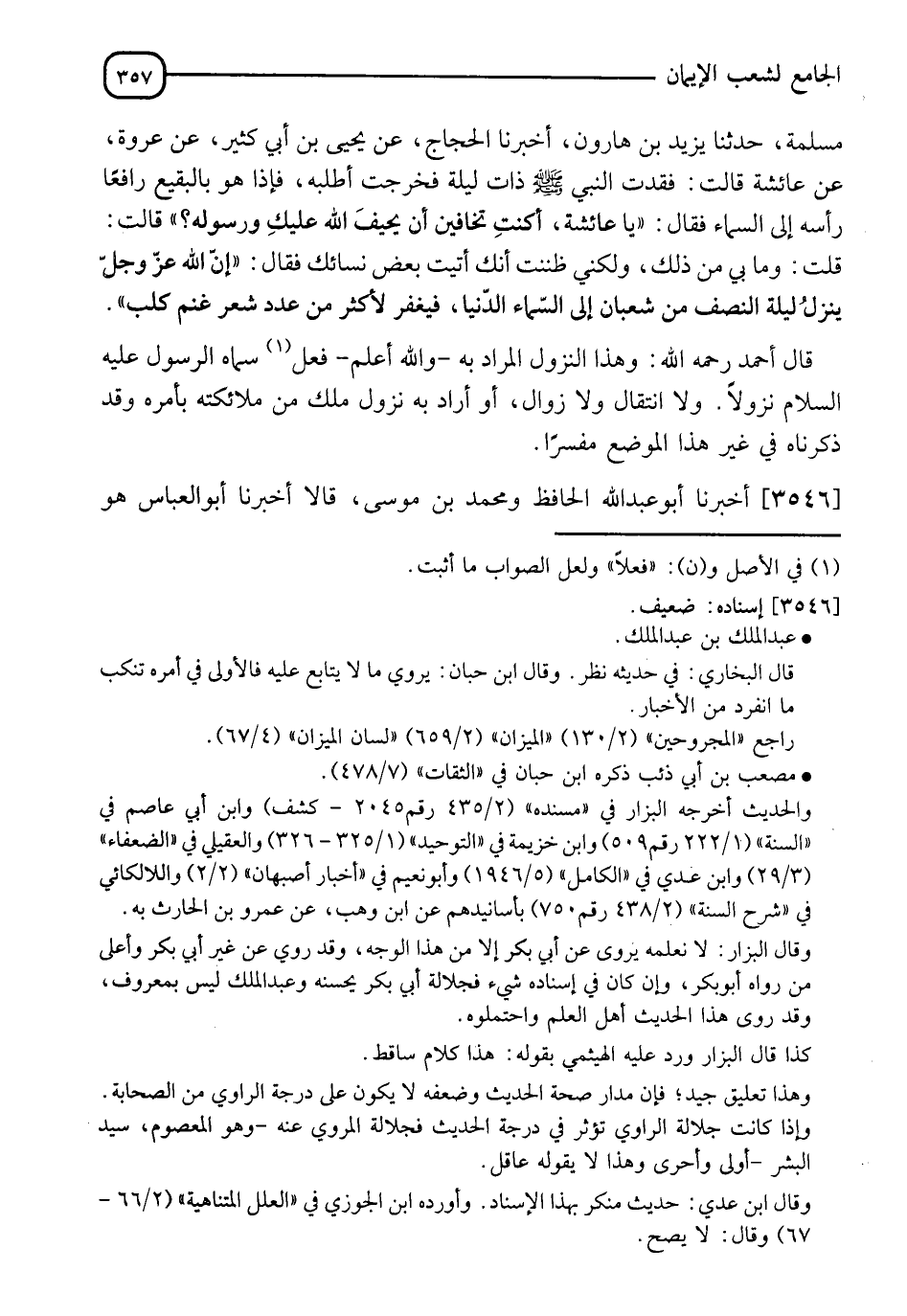 3546 - أَخْبَرَنَا أَبُو عَبْدِ اللهِ الْحَافِظُ، وَمُحَمَّدُ بْنُ مُوسَى، قَالَا: أَخْبَرَنَا أَبُو الْعَبَّاسِ هُوَ -[358]- الْأَصَمُّ، حَدَّثَنَا مُحَمَّدُ بْنُ إِسْحَاقَ، أَخْبَرَنَا خَالِدُ بْنُ خِدَاشٍ، وَأَصْبَغُ بْنُ الْفَرَجِ، قَالَا: حَدَّثَنَا ابْنُ وَهْبٍ، عَنْ عَمْرِو بْنِ الْحَارِثِ، عَنْ عَبْدِ الْمَلِكِ بْنِ عَبْدِ الْمَلِكِ، أَنَّ مُصْعَبَ بْنَ أَبِي ذِئْبٍ حَدَّثَهُ، عَنِ الْقَاسِمِ بْنِ مُحَمَّدِ بْنِ أَبِي بَكْرٍ، عَنْ أَبِيهِ، أَوْ عَنْ عَمِّهِ، عَنْ جَدِّهِ: عَنِ النَّبِيِّ صَلَّى اللَّهُ عَلَيْهِ وَسَلَّمَ، قَالَ: §" يَنْزِلُ اللهُ إِلَى السَّمَاءِ الدُّنْيَا لَيْلَةَ النِّصْفِ مِنْ شَعْبَانَ فَيَغْفِرُ لِكُلِّ شَيْءٍ إِلَّا رَجُلٍ مُشْرِكٍ أَوْ فِي قَلْبِهِ شَحْنَاءُ "