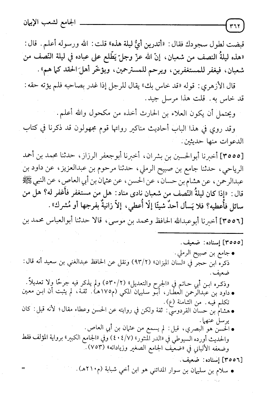 3555 - أَخْبَرَنَا أَبُو الْحُسَيْنِ بْنُ بِشْرانَ، أَخْبَرَنَا أَبُو جَعْفَرٍ الرَّزَّازُ، حَدَّثَنَا مُحَمَّدُ بْنُ أَحْمَدَ الرِّيَاحِيُّ، حَدَّثَنَا جَامِعُ بْنُ صُبَيْحٍ الرَّمْلِيُّ، حَدَّثَنَا مَرْحُومُ بْنُ عَبْدِ الْعَزِيزِ، عَنْ دَاوُدَ بْنِ عَبْدِ الرَّحْمَنِ، عَنْ هِشَامِ بْنِ حَسَّانَ، عَنِ الْحَسَنِ، عَنْ عُثْمَانَ بْنِ أَبِي الْعَاصِ، عَنِ النَّبِيِّ صَلَّى اللَّهُ عَلَيْهِ وَسَلَّمَ، قَالَ: " §إِذَا كَانَ لَيْلَةُ النِّصْفِ مِنْ شَعْبَانَ نَادَى مُنَادٍ: هَلْ مِنْ مُسْتَغْفِرٍ فَأَغْفِرَ لَهُ، هَلْ مِنْ سَائِلٍ فَأُعْطِيَهُ فَلَا يَسْأَلُ أَحَدٌ شَيْئًا إِلَّا أُعْطِيَ إِلَّا زَانِيَةٌ بِفَرْجِهَا أَوْ مُشْرِكٌ "