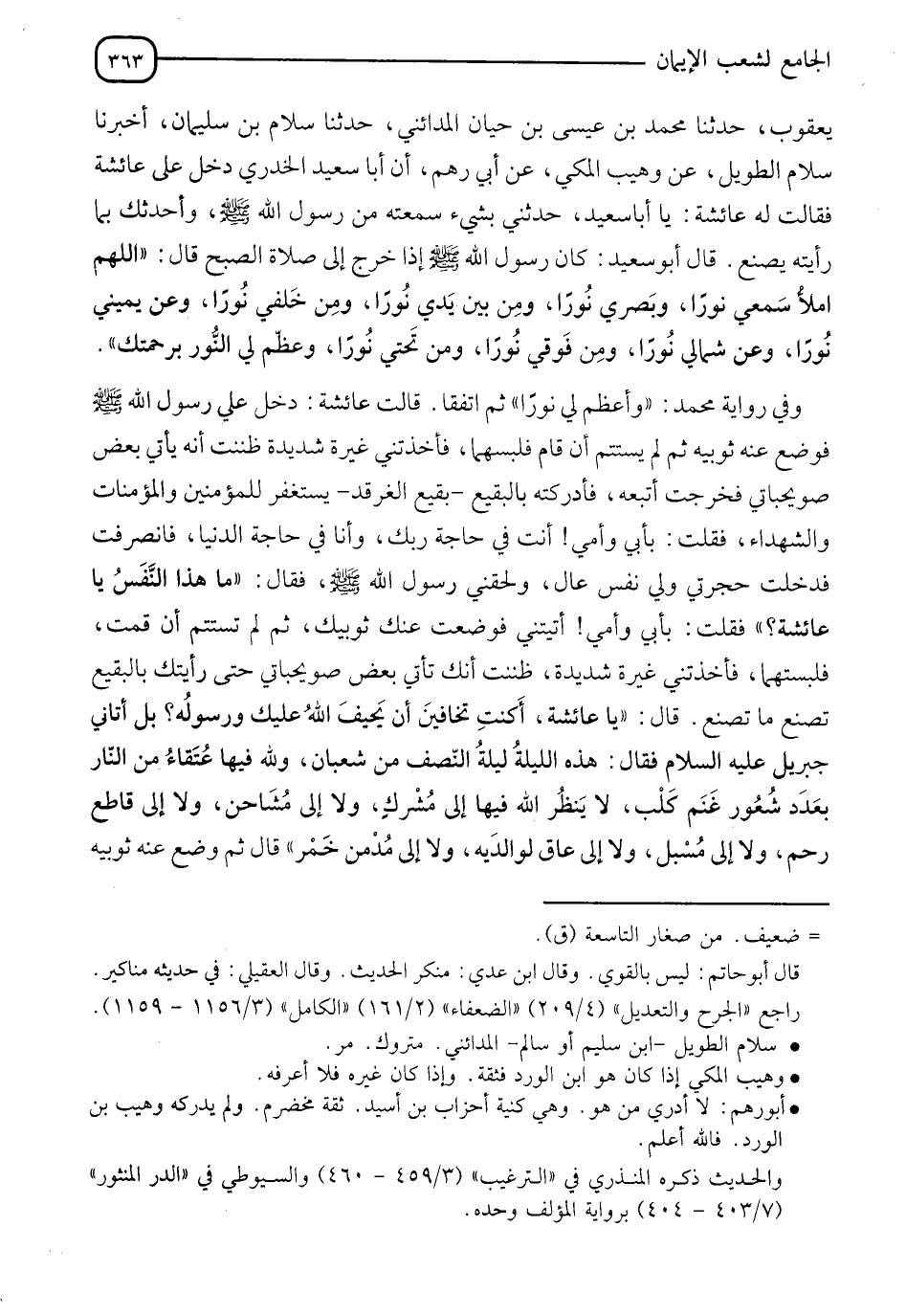 قَالَتْ عَائِشَةُ: دَخَلَ عَلَيَّ رَسُولُ اللهِ صَلَّى اللَّهُ عَلَيْهِ وَسَلَّمَ فَوَضَعَ عَنْهُ ثَوْبَيْهِ ثُمَّ لَمْ يَسْتَتِمَّ أَنْ قَامَ فَلَبِسَهُمَا فَأَخَذَتْنِي غَيْرَةٌ شَدِيدَةٌ ظَنَنْتُ أَنَّهُ يَأْتِي بَعْضَ صُوَيْحِباتِي فَخَرَجْتُ أَتْبَعَهُ فَأَدْرَكْتُهُ بِالْبَقِيعِ بَقِيعِ الْغَرْقَدِ يَسْتَغْفِرُ لِلْمُؤْمِنِينَ وَالْمُؤْمِنَاتِ وَالشُّهَدَاءِ، فَقُلْتُ: بِأَبِي وَأُمِّي أَنْتَ فِي حَاجَةِ رَبِّكَ، وَأَنَا فِي حَاجَةِ الدُّنْيَا فَانْصَرَفْتُ، فَدَخَلْتُ حُجْرَتِي وَلِي نَفَسٌ عَالٍ، وَلَحِقَنِي رَسُولُ اللهِ صَلَّى اللَّهُ عَلَيْهِ وَسَلَّمَ، فَقَالَ: " مَا هَذَا النَّفَسُ يَا عَائِشَةُ؟ "، فَقُلْتُ: بِأَبِي وَأُمِّي أَتَيْتَنِي فَوَضَعْتَ عَنْكَ ثَوْبَيْكَ ثُمَّ لَمْ تَسْتَتِمَّ أَنْ قُمْتَ فَلَبِسْتَهُمَا فَأَخَذَتْنِي غَيْرَةٌ شَدِيدَةٌ، ظَنَنْتُ أَنَّكَ تَأْتِي بَعْضَ صُوَيْحِباتِي حَتَّى رَأَيْتُكَ بِالْبَقِيعِ تَصْنَعُ مَا تَصْنَعُ، قَالَ: " يَا عَائِشَةُ §أَكُنْتِ تَخَافِينَ أَنْ يَحِيفَ اللهُ عَلَيْكِ وَرَسُولُهُ، بَلْ أَتَانِي جِبْرِيلُ عَلَيْهِ السَّلَامُ، فَقَالَ: هَذِهِ اللَّيْلَةُ لَيْلَةُ النِّصْفِ مِنْ شَعْبَانَ وَلِلَّهِ فِيهَا عُتَقَاءُ مِنَ النَّارِ بِعَدَدِ شُعُورِ غَنَمِ كَلْبٍ، لَا يَنْظُرُ اللهُ فِيهَا إِلَى مُشْرِكٍ، وَلَا إِلَى مُشَاحِنٍ، وَلَا إِلَى قَاطِعِ رَحِمٍ، وَلَا إِلَى مُسْبِلٍ، وَلَا إِلَى عَاقٍّ لِوَالِدَيْهِ، وَلَا إِلَى مُدْمِنِ خَمْرٍ " قَالَ: ثُمَّ وَضْعَ عَنْهُ ثَوْبَيْهِ، -[364]- فَقَالَ لِي: " يَا عَائِشَةُ تَأْذَنِينَ لِي فِي قِيَامِ هَذِهِ اللَّيْلَةِ؟ "، فَقُلْتُ: نَعَمْ بِأَبِي وَأُمِّي، فَقَامَ فَسَجَدَ لَيْلًا طَوِيلًا حَتَّى ظَنَنْتُ أَنَّهُ قُبِضَ فَقُمْتُ أَلْتَمِسْهُ، وَوَضَعْتُ يَدِي عَلَى بَاطِنِ قَدَمَيْهِ فَتَحَرَّكَ فَفَرِحْتُ وَسَمِعْتُهُ يَقُولُ فِي سُجُودِهِ: " أَعُوذُ بِعَفْوِكَ مِنْ عِقَابِكَ، وَأَعُوذُ بِرِضَاكَ مِنْ سَخَطِكَ، وَأَعُوذُ بِكَ مِنْكَ، جَلَّ وَجْهُكَ، لَا أُحْصِي ثَنَاءً عَلَيْكَ أَنْتَ كَمَا أَثْنَيْتَ عَلَى نَفْسِكَ "، فَلَمَّا أَصْبَحَ ذَكَرْتُهُنَّ لَهُ فَقَالَ: " يَا عَائِشَةُ تَعَلَّمْتِهُنَّ؟ "، فَقُلْتُ: نَعَمْ، فَقَالَ: " تَعَلَّمِيهِنَّ وَعَلِّمِيهِنَّ، فَإِنَّ جِبْرِيلَ عَلَيْهِ السَّلَامُ عَلَّمَنِيهِنَّ وَأَمَرَنِي أَنْ أُرَدِّدَهُنَّ فِي السُّجُودِ "، " هَذَا إِسْنَادٌ ضَعِيفٌ وَرُوِيَ مِنْ وَجْهٍ آخَرَ "