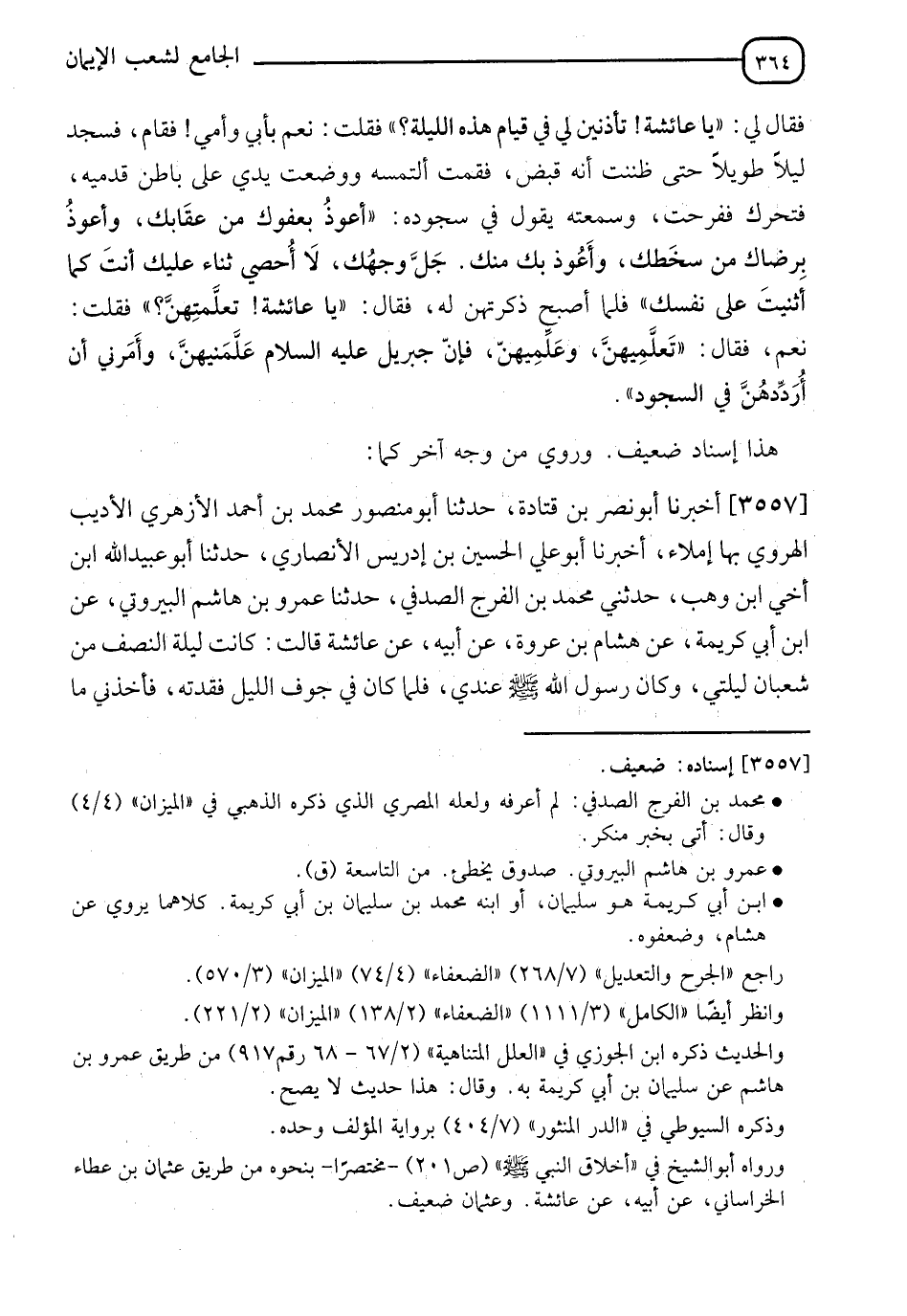 3557 - كَمَا أَخْبَرَنَا أَبُو نَصْرِ بْنُ قَتَادَةَ، حَدَّثَنَا أَبُو مَنْصُورٍ مُحَمَّدُ بْنُ أَحْمَدَ الْأَزْهَرِيُّ الْأَدِيبُ الْهَرَوِيُّ بِهَا إِمْلَاءً، أَخْبَرَنَا أَبُو عَلِيٍّ الْحُسَيْنُ بْنُ إِدْرِيسَ الْأَنْصَارِيُّ، حَدَّثَنَا أَبُو عُبَيْدِ اللهِ ابْنُ أَخِي ابْنِ وَهْبٍ، حَدَّثَنِي مُحَمَّدُ بْنُ الْفَرَجِ الصَّدَفِيُّ، حَدَّثَنَا عَمْرُو بْنُ هَاشِمٍ الْبَيْرُوتِيُّ، عَنِ ابْنِ أَبِي كَرِيمَةَ، عَنْ هِشَامِ بْنِ عُرْوَةَ، عَنْ أَبِيهِ، عَنْ عَائِشَةَ، قَالَتْ: كَانَتْ لَيْلَةُ النِّصْفِ مِنْ شَعْبَانَ لَيْلَتِي، وَكَانَ رَسُولُ اللهِ صَلَّى اللَّهُ عَلَيْهِ وَسَلَّمَ عِنْدِي، فَلَمَّا كَانَ فِي جَوْفِ اللَّيْلِ فَقَدْتُهُ، فَأَخَذَنِي مَا -[365]- يَأْخُذُ النِّسَاءَ مِنَ الْغَيْرَةِ فَتَلَفَّفْتُ بِمِرْطِي أَمَّا وَاللهِ مَا كَانَ خَزٌّ، وَلَا قَزٌّ، وَلَا حَرِيرٌ، وَلَا دِيبَاجٌ، وَلَا قُطْنٌ، وَلَا كَتَّانٌ، قِيلَ لَهَا: مِمَّ كَانَ يَا أُمَّ الْمُؤْمِنِينَ؟، قَالَتْ: كَانَ سُدَاهُ شَعْرًا وَلُحْمَتُهُ مِنْ أَوْبارِ الْإِبِلِ، قَالَتْ: فَطَلَبْتُهُ فِي حُجَرِ نِسَائِهِ فَلَمْ أَجِدْهُ فَانْصَرَفْتُ إِلَى حُجْرَتِي فَإِذَا أَنَا بِهِ كَالثَّوْبِ السَّاقِطِ وَهُوَ يَقُولُ فِي سُجُودِهِ: " §سَجَدَ لَكَ خَيَالِي وَسَوَادِي، وَآمَنَ بِكَ فُؤَادِي، فَهَذِهِ يَدِي وَمَا جَنَيْتُ بِهَا عَلَى نَفْسِي يَا عَظِيمُ يُرْجَى لِكُلِّ عَظِيمٍ، يَا عَظِيمُ اغْفِرِ الذَّنْبَ الْعَظِيمَ، سَجَدَ وَجْهِي لِلَّذِي خَلْقَهُ وَشَقَّ سَمْعَهُ وَبَصَرَهُ "، ثُمَّ رَفَعَ رَأْسَهُ، ثُمَّ عَادَ سَاجِدًا، فَقَالَ: " أَعُوذُ بِرِضَاكَ مِنْ سَخَطِكَ، وَأَعُوذُ بِعَفْوِكَ مِنْ عِقَابِكَ، وَأَعُوذُ بِكَ مِنْكَ لَا أُحْصِي ثَنَاءً عَلَيْكَ أَنْتَ كَمَا أَثْنَيْتَ عَلَى نَفْسِكَ، أَقُولُ كَمَا قَالَ أَخِي دَاوُدُ، أَعْفُرُ وَجْهِي فِي التُّرَابِ لِسَيِّدِي، وَحَقٌّ لَهُ أَنْ يُسْجَدَ "، ثُمَّ رَفَعَ رَأْسَهُ، فَقَالَ: " اللهُمَّ ارْزُقْنِي قَلْبًا تَقِيًّا مِنَ الشَّرِّ نَقِيًّا لَا جَافِيًا وَلَا شَقِيًّا "، ثُمَّ انْصَرَفَ فَدَخَلَ مَعِي فِي الْخَمِيلَةِ وَلِي نَفَسٌ عَالٍ، فَقَالَ: " مَا هَذَا النَّفَسُ يَا حُمَيْرَاءُ؟ "، فَأَخْبَرْتُهُ فَطَفِقَ يَمْسَحُ بِيَدَيْهِ عَلَى رُكْبَتِي، وَهُوَ يَقُولُ: " وَيْحَ هَاتَيْنِ الرُّكْبَتَيْنِ مَا لَقِيَتَا هَذِهِ اللَّيْلَةَ، لَيْلَةَ النِّصْفِ مِنْ شَعْبَانَ يَنْزِلُ اللهُ تَعَالَى فِيهَا إِلَى السَّمَاءِ الدُّنْيَا فَيَغْفِرُ لِعِبَادِهِ إِلَّا الْمُشْرِكَ والْمُشَاحِنَ "