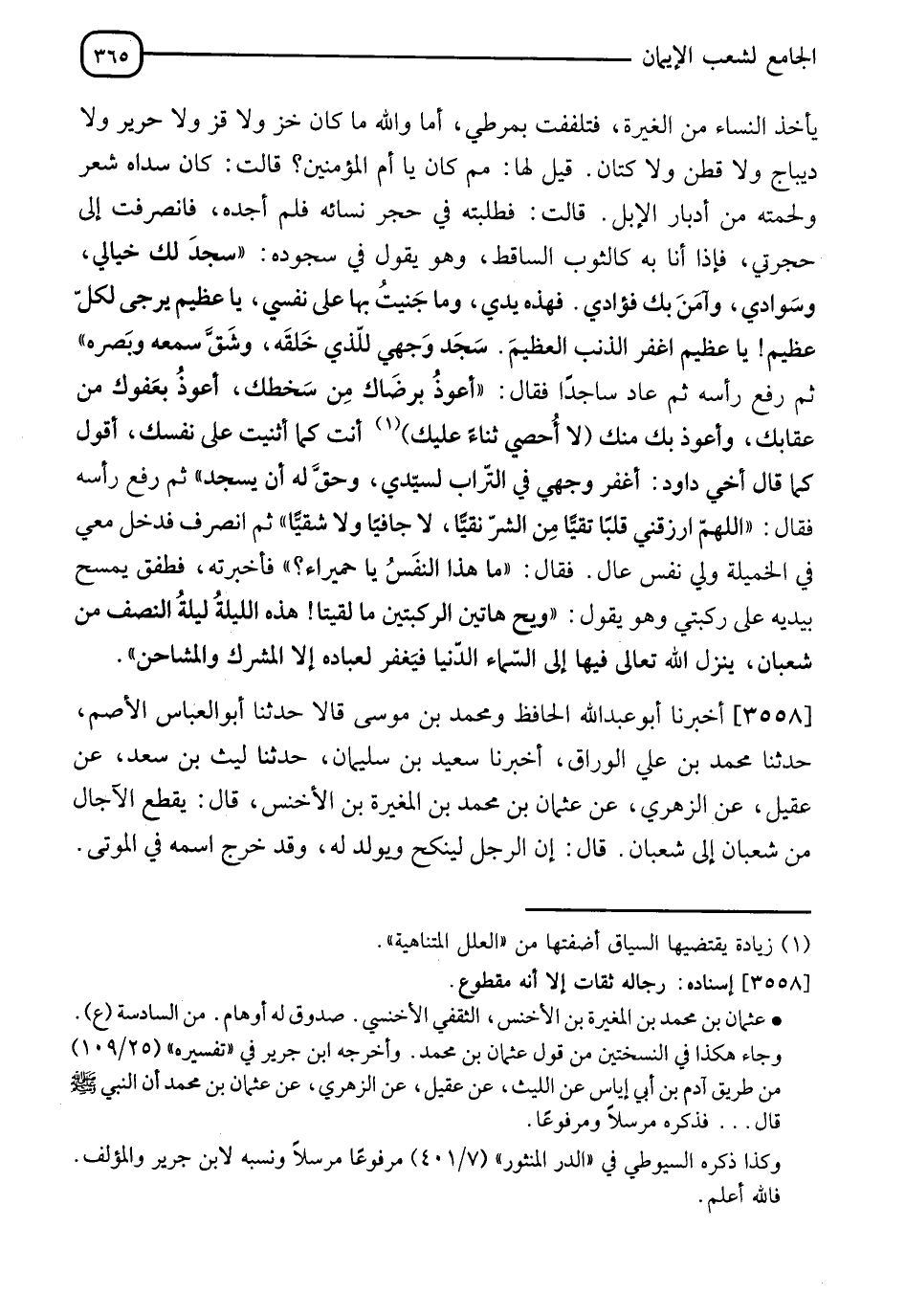 3558 - أَخْبَرَنَا أَبُو عَبْدِ اللهِ الْحَافِظُ، وَمُحَمَّدُ بْنُ مُوسَى، قَالَا: حَدَّثَنَا أَبُو الْعَبَّاسِ الْأَصَمُّ، حَدَّثَنَا مُحَمَّدُ بْنُ عَلِيٍّ الْوَرَّاقُ، أَخْبَرَنَا سَعِيدُ بْنُ سُلَيْمَانَ، حَدَّثَنَا لَيْثُ بْنُ سَعْدٍ، عَنْ عُقَيْلٍ، عَنِ الزُّهْرِيِّ، عَنْ عُثْمَانَ بْنِ مُحَمَّدِ بْنِ الْمُغِيرَةِ بْنِ الْأَخْنَسِ، قَالَ: " §تُقْطَعُ الْآجَالُ مِنْ شَعْبَانَ إِلَى شَعْبَانَ "، قَالَ: " إِنَّ الرَّجُلَ لَيَنْكِحُ، وَيُولَدُ لَهُ، وَقَدْ خَرَجَ اسْمُهُ فِي الْمَوْتَى "
