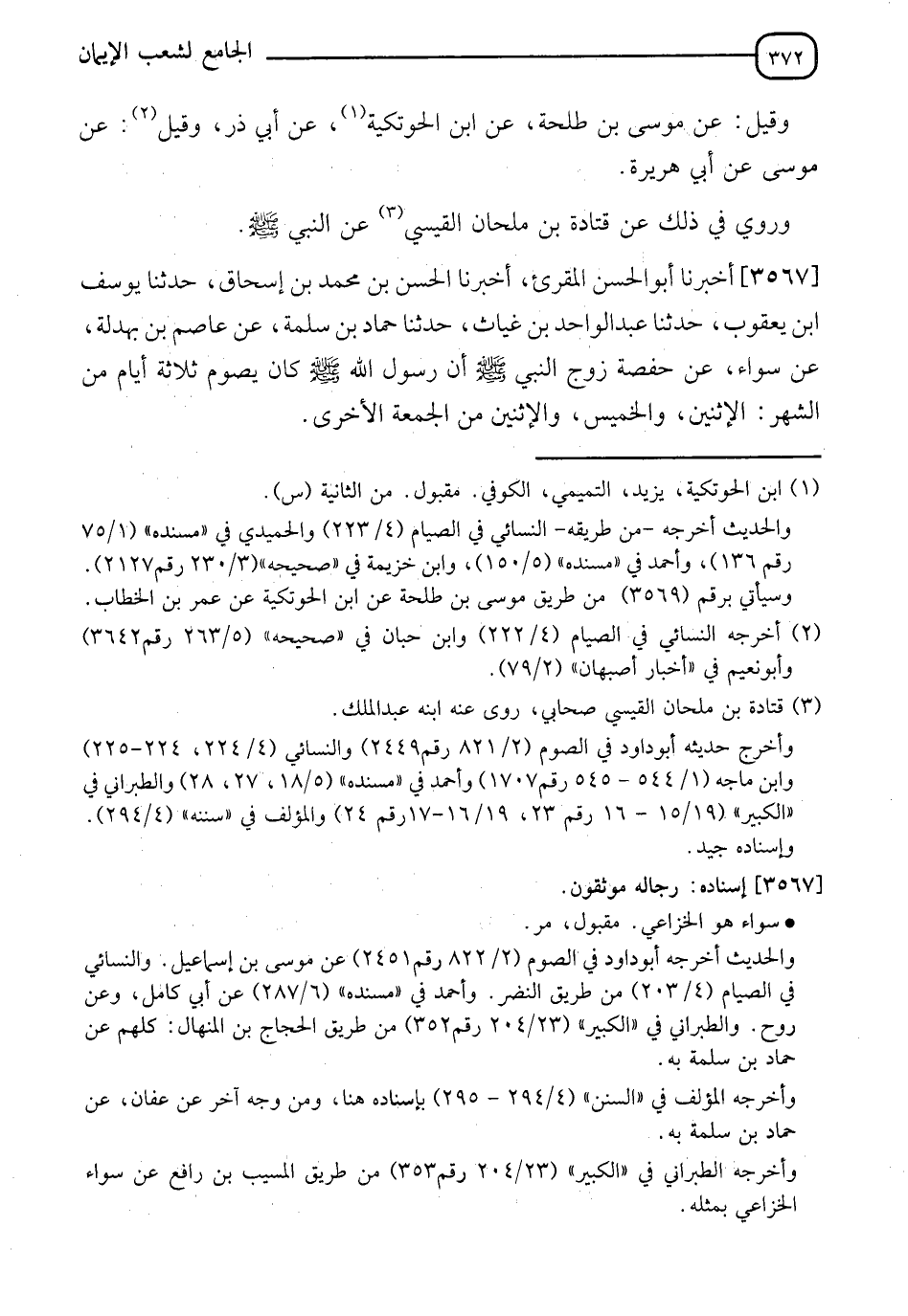 3567 - أَخْبَرَنَا أَبُو الْحَسَنِ الْمُقْرِئُ، أَخْبَرَنَا الْحَسَنُ بْنُ مُحَمَّدِ بْنِ إِسْحَاقَ، حَدَّثَنَا يُوسُفُ بْنُ يَعْقُوبَ، حَدَّثَنَا عَبْدُ الْوَاحِدِ بْنُ غِيَاثٍ، حَدَّثَنَا حَمَّادُ بْنُ سَلَمَةَ، عَنْ عَاصِمِ ابْنِ بَهْدَلَةَ، عَنْ سَوَاءٍ، عَنْ حَفْصَةَ، زَوْجِ النَّبِيِّ صَلَّى اللَّهُ عَلَيْهِ وَسَلَّمَ: " أَنَّ رَسُولَ اللهِ صَلَّى اللَّهُ عَلَيْهِ وَسَلَّمَ كَانَ §يَصُومُ ثَلَاثَةَ أَيَّامٍ مِنَ الشَّهْرِ الِاثْنَيْنِ وَالْخَمِيسَ، وَالِاثْنَيْنِ مِنَ الْجُمُعَةِ الْأُخْرَى "
