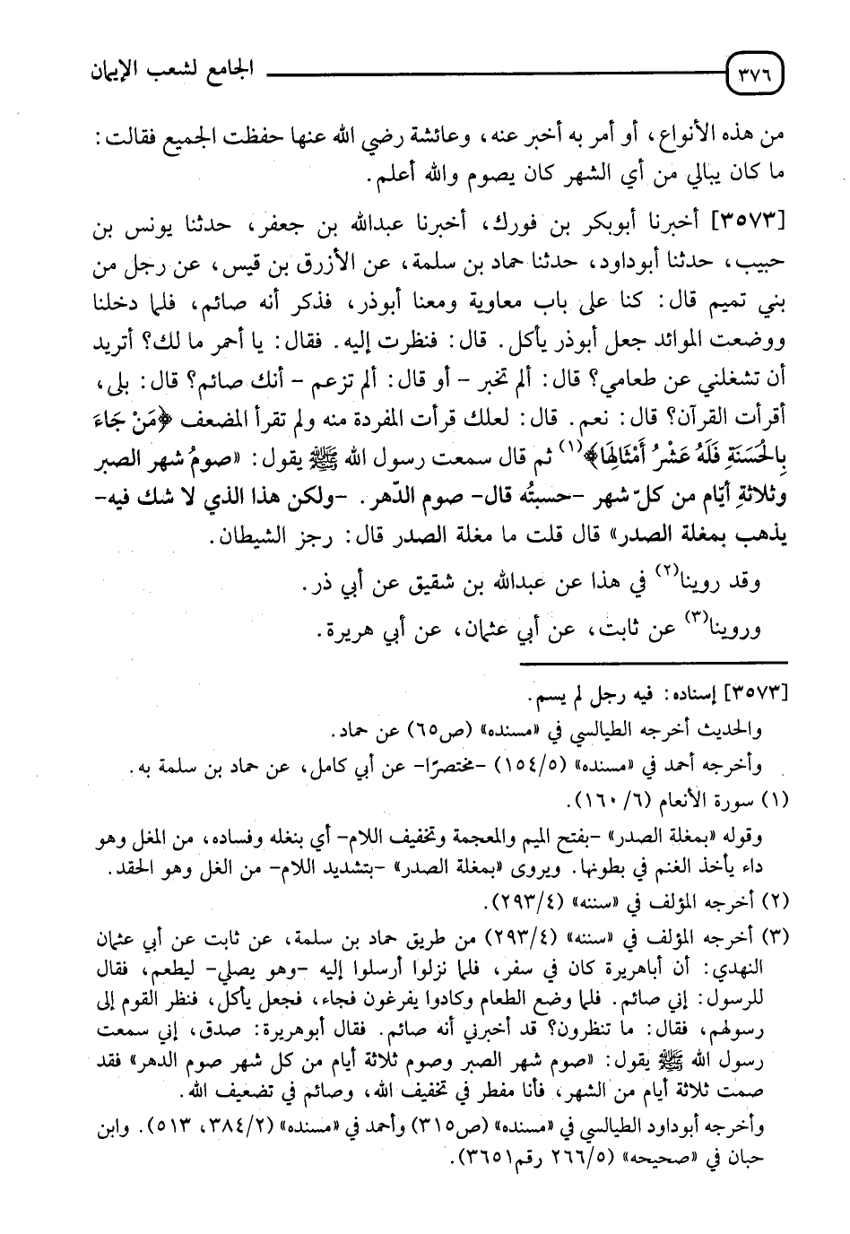 3573 - أَخْبَرَنَا أَبُو بَكْرِ بْنُ فُورَكٍ، أَخْبَرَنَا عَبْدُ اللهِ بْنُ جَعْفَرٍ، حَدَّثَنَا يُونُسُ بْنُ حَبِيبٍ، حَدَّثَنَا أَبُو دَاوُدَ، حَدَّثَنَا حَمَّادُ بْنُ سَلَمَةَ، عَنِ الْأَزْرَقِ بْنِ قَيْسٍ، عَنْ رَجُلٍ، مِنْ بَنِي تَمِيمٍ، قَالَ: كُنَّا عَلَى بَابِ مُعَاوِيَةَ وَمَعَنَا أَبُو ذَرٍّ فَذَكَرَ أَنَّهُ صَائِمٌ، فَلَمَّا دَخَلْنَا وَوُضِعَتِ الْمَوَائِدُ جَعَلَ أَبُو ذَرٍّ يَأْكُلُ، قَالَ: فَنَظَرْتُ إِلَيْهِ، فقَالَ: يَا أَحْمَرُ مَا لَكَ أَتُرِيدُ أَنْ تَشْغَلَنِي عَنْ طَعَامِي؟، قَالَ: أَلَمْ تُخْبِرْ أَوْ قَالَ: أَلَمْ تَزْعُمْ أَنَّكَ صَائِمٌ؟، قَالَ: بَلَى، أَقْرَأَتَ الْقُرْآنَ؟، قَالَ: نَعَمْ، قَالَ: لَعَلَّكَ قَرَأْتَ الْمُفْرَدَةَ مِنْهُ وَلَمْ تَقْرَأْ الْمُضَعَّفَ {مَنْ جَاءَ بِالْحَسَنَةِ فَلَهُ عَشْرُ أَمْثَالِهَا} [الأنعام: 160]، ثُمَّ قَالَ: سَمِعْتُ رَسُولَ اللهِ صَلَّى اللَّهُ عَلَيْهِ وَسَلَّمَ يَقُولُ: " §صَوْمُ شَهْرِ الصَّبْرِ، وَثَلَاثَةِ أَيَّامٍ مِنْ كُلِّ شَهْرٍ " حَسِبْتُهُ قَالَ: " صَوْمُ الدَّهْرِ، وَلَكِنَّ هَذَا الَّذِي لَا شَكَّ فِيهِ يَذْهَبُ بِمَغَلَّةِ الصَّدْرِ، قَالَ قُلْتُ: مَا مَغَلَّةُ الصَّدْرِ؟ قَالَ: رِجْزُ الشَّيْطَانِ "