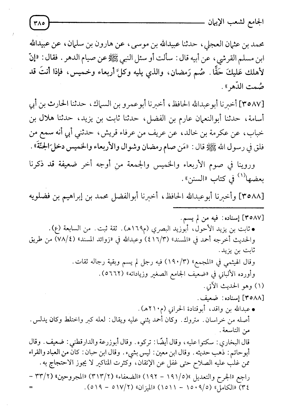 3587 - أَخْبَرَنَا أَبُو عَبْدِ اللهِ الْحَافِظُ، أَخْبَرَنَا أَبُو عَمْرِو بْنِ السَّمَّاكِ، حَدَّثَنَا الْحَارِثُ بْنُ أَبِي أُسَامَةَ، حَدَّثَنَا أَبُو النُّعْمَانِ عَارِمٌ بْنُ الْفَضْلِ، حَدَّثَنَا ثَابِتُ بْنُ يَزِيدَ، حَدَّثَنَا هِلَالُ بْنُ خَبَّابٍ، عَنْ عِكْرِمَةَ بْنِ خَالِدٍ، عَنْ عَرِيفٍ، مِنْ عُرَفَاءِ قُرَيْشٍ، حَدَّثَنِي أَبِي أَنَّهُ، سَمِعَ مِنْ فَلْقِ فِيِّ رَسُولِ اللهِ صَلَّى اللَّهُ عَلَيْهِ وَسَلَّمَ، قَالَ: " §مَنْ صَامَ رَمَضَانَ، وَشَوَّالَ، وَالْأَرْبِعَاءَ، وَالْخَمِيسَ دَخَلَ الْجَنَّةَ ". " وَرُوِّينَا فِي صَوْمِ الْأَرْبِعَاءِ وَالْخَمِيسِ وَالْجُمُعَةِ مِنْ أَوْجُهٍ أُخَرَ ضَعِيفَةٌ قَدْ ذَكَرْنَا بَعْضَهَا فِي كِتَابِ السُّنَنِ "