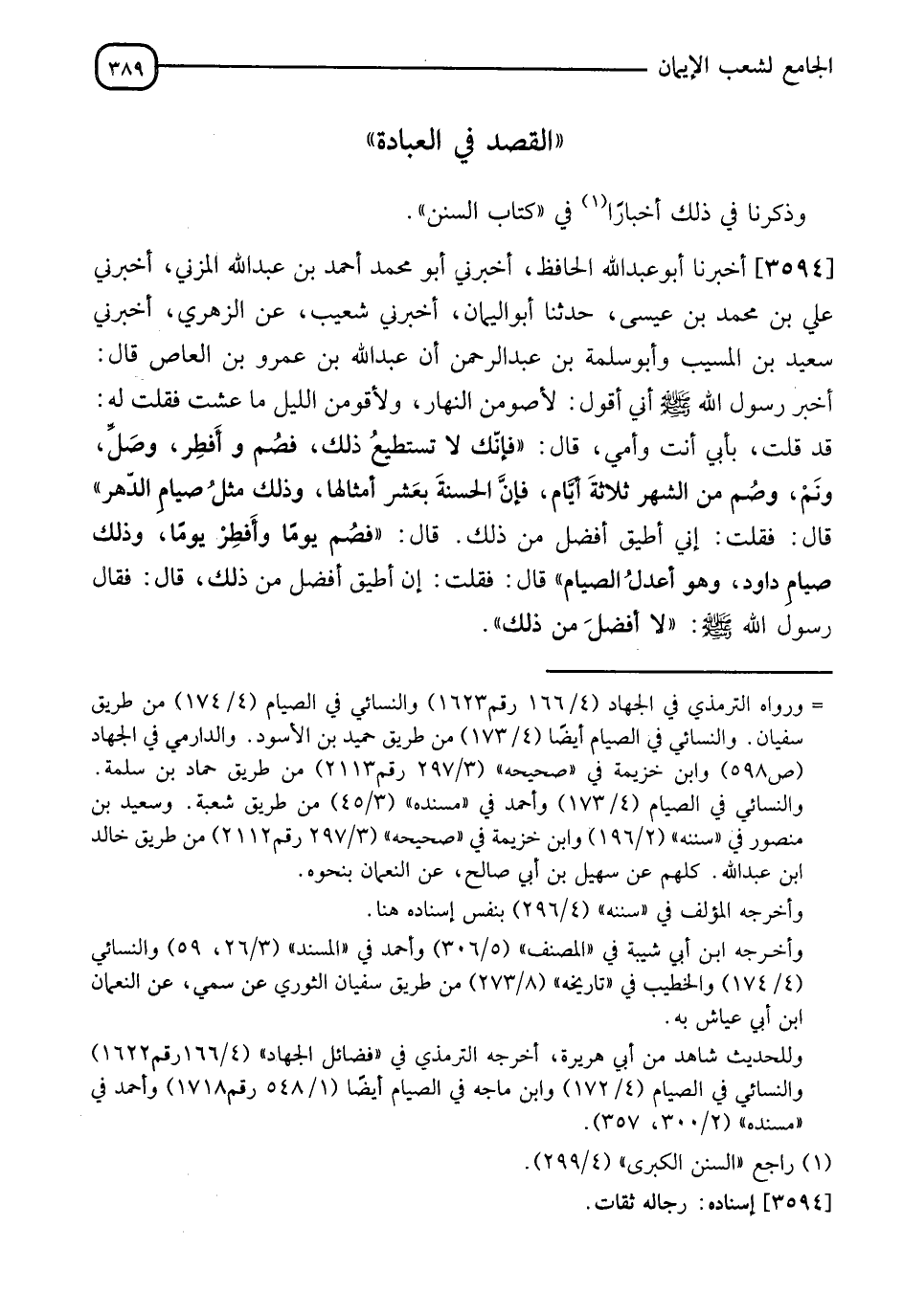 3594 - أَخْبَرَنَا أَبُو عَبْدِ اللهِ الْحَافِظُ، أَخْبَرَنِي أَبُو مُحَمَّدٍ أَحْمَدُ بْنُ عَبْدِ اللهِ الْمُزَنِيُّ، أَخْبَرَنِي عَلِيُّ بْنُ مُحَمَّدِ بْنِ عِيسَى، حَدَّثَنَا أَبُو الْيَمَانِ، أَخْبَرَنِي شُعَيْبٌ، عَنِ الزُّهْرِيِّ، أَخْبَرَنِي سَعِيدُ بْنُ الْمُسَيِّبِ، وَأَبُو سَلَمَةَ بْنِ عَبْدِ الرَّحْمَنِ، أَنَّ عَبْدَ اللهِ بْنَ عَمْرِو بْنِ الْعَاصِ، قَالَ: أُخْبِرَ رَسُولُ اللهِ صَلَّى اللَّهُ عَلَيْهِ وَسَلَّمَ أَنِّي أَقُولُ: لَأَصُومَنَّ النَّهَارَ وَلَأَقُومَنَّ اللَّيْلَ مَا عِشْتُ، فَقُلْتُ لَهُ: قَدْ قُلْتُ بِأَبِي أَنْتَ وَأُمِّي، قَالَ: " فَإِنَّكَ لَا تَسْتَطِيعُ ذَلِكَ، §فَصُمْ وَأَفْطِرْ، وَصَلِّ وَنَمْ، وَصُمْ مِنَ الشَّهْرِ ثَلَاثَةَ أَيَّامٍ، فَإِنَّ الْحَسَنَةَ بِعَشْرِ أَمْثَالِهَا، وَذَلِكَ مِثْلُ صِيَامِ الدَّهْرِ "، قَالَ: فَقُلْتُ: إِنِّي أُطِيقُ أَفْضَلَ مِنْ ذَلِكَ، قَالَ: " فَصُمْ يَوْمًا وَأَفْطِرْ يَوْمًا وَذَلِكَ صِيَامُ دَاوُدَ، وَهُوَ أَعْدَلُ الصِّيَامِ "، قَالَ: فَقُلْتُ: إِنِّي أُطِيقُ أَفْضَلَ مِنْ ذَلِكَ، قَالَ: فَقَالَ رَسُولُ اللهِ صَلَّى اللَّهُ عَلَيْهِ وَسَلَّمَ: " لَا أَفْضَلَ مِنْ ذَلِكَ ". -[390]- رَوَاهُ الْبُخَارِيُّ فِي الصَّحِيحِ، عَنْ أَبِي الْيَمَانِ