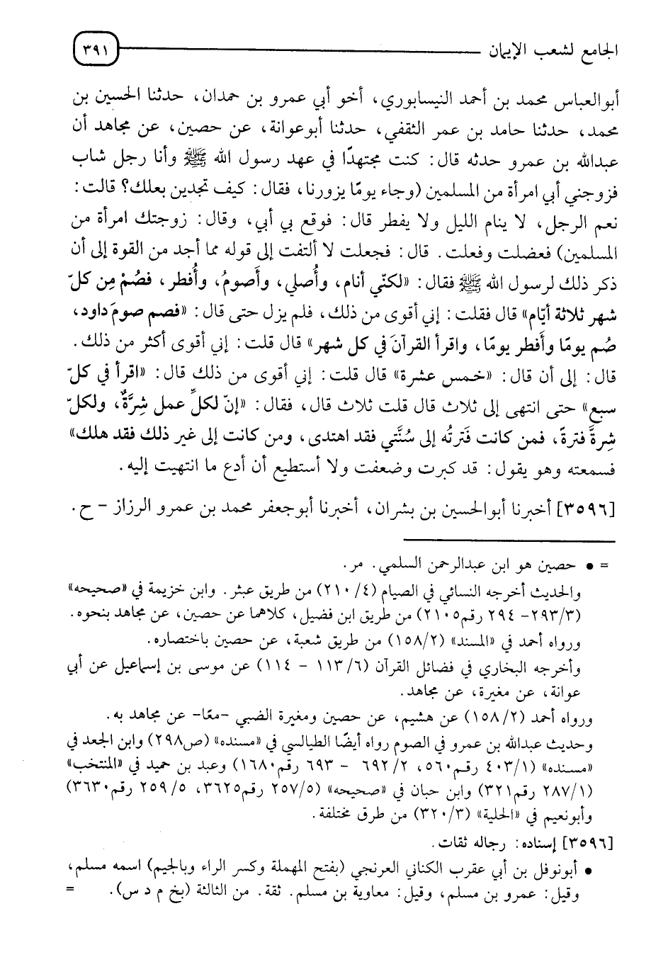 3596 - أَخْبَرَنَا أَبُو الْحُسَيْنِ بْنُ بِشْرانَ، أَخْبَرَنَا أَبُو جَعْفَرٍ مُحَمَّدُ بْنُ عَمْرٍو الرَّزَّازُ، ح -[392]- وأَخْبَرَنَا أَبُو عَبْدِ اللهِ الْحُسَيْنُ بْنُ الْحَسَنِ الْغَضَايِرِيُّ، حَدَّثَنَا مُحَمَّدُ بْنُ عَمْرِو بْنِ الْبَخْتَرِيِّ، حَدَّثَنَا سَعْدَانُ بْنُ نَصْرٍ الْبَزَّازُ، حَدَّثَنَا وَكِيعُ بْنُ الْجَرَّاحِ، عَنِ الْأَسْوَدِ بْنِ شَيْبَانَ، عَنْ أَبِي نَوْفَلِ بْنِ أَبِي عَقْرَبٍ، عَنْ أَبِيهِ، قَالَ: سَأَلْتُ النَّبِيَّ صَلَّى اللَّهُ عَلَيْهِ وَسَلَّمَ عَنِ الصَّوْمِ، قَالَ: " §صُمْ يَوْمًا مِنَ الشَّهْرِ "، قَالَ: قُلْتُ: يَا رَسُولَ اللهِ إِنِّي أَقْوَى، فَقَالَ: " إِنِّي أَقْوَى، إِنِّي أَقْوَى "، قَالَ: " صُمْ يَوْمَيْنِ مِنَ الشَّهْرِ "، قُلْتُ: يَا رَسُولَ اللهِ زِدْنِي، قَالَ رَسُولُ اللهِ صَلَّى اللَّهُ عَلَيْهِ وَسَلَّمَ: " صُمْ ثَلَاثَةَ أَيَّامٍ مِنَ الشَّهْرِ "