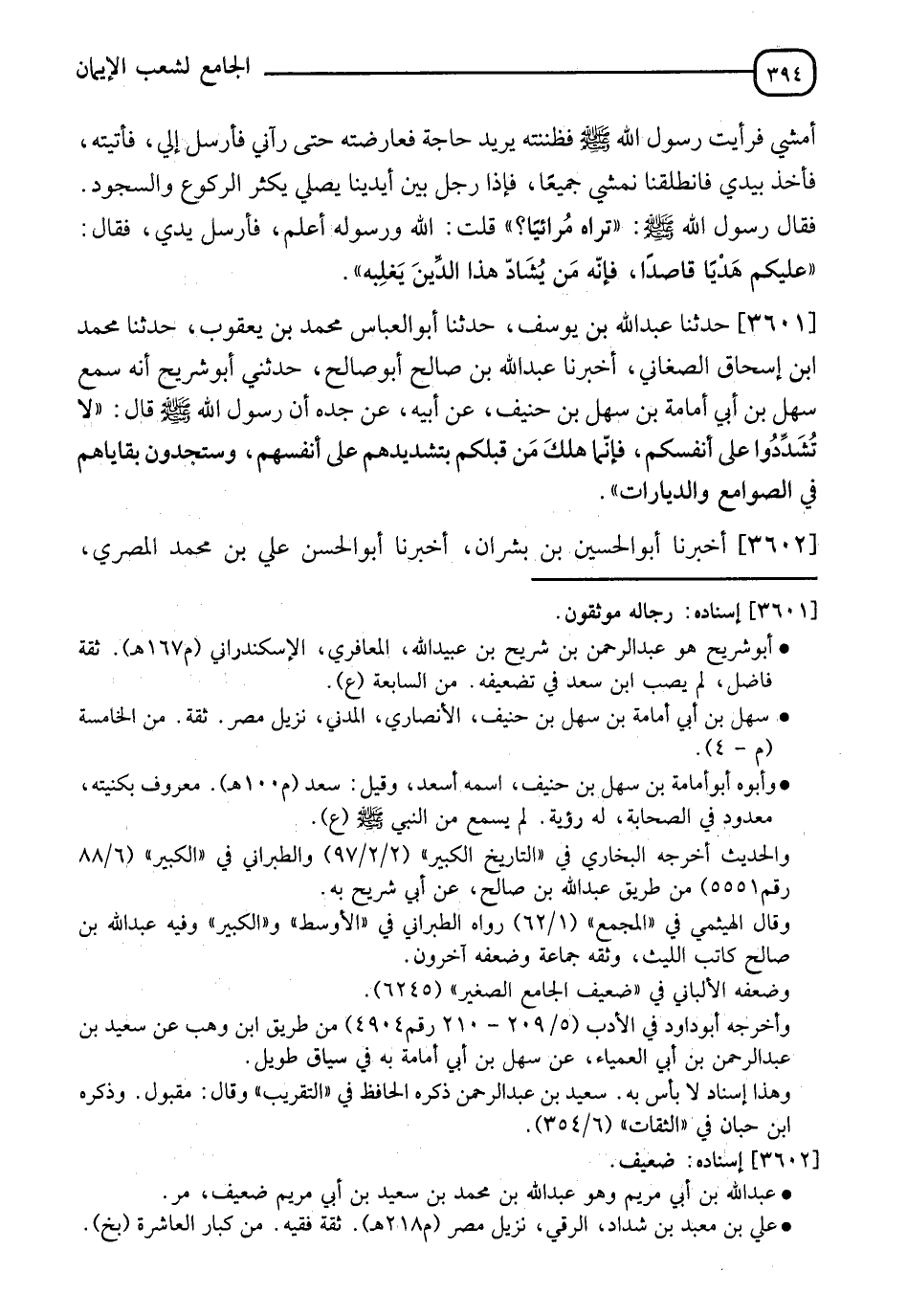 3601 - حَدَّثَنَا عَبْدُ اللهِ بْنُ يُوسُفَ، حَدَّثَنَا أَبُو الْعَبَّاسِ مُحَمَّدُ بْنُ يَعْقُوبَ، حَدَّثَنَا مُحَمَّدُ بْنُ إِسْحَاقَ الصَّغَانِيُّ، أَخْبَرَنَا عَبْدُ اللهِ بْنُ صَالِحٍ أَبُو صَالِحٍ، حَدَّثَنِي أَبُو شُرَيْحٍ، أَنَّهُ سَمِعَ سَهْلَ بْنَ أَبِي أُمَامَةَ بْنِ سَهْلِ بْنِ حُنَيْفٍ، عَنْ أَبِيهِ، عَنْ جَدِّهِ: أَنَّ رَسُولَ اللهِ صَلَّى اللَّهُ عَلَيْهِ وَسَلَّمَ قَالَ: " §لَا تُشَدِّدُوا عَلَى أَنْفُسِكُمْ، فَإِنَّمَا هَلَكَ مَنْ كَانَ قِبَلَكُمْ بِتَشْدِيدِهِمْ عَلَى أَنْفُسِهِمْ، وَسَتَجِدُونَ بَقَايَاهُمْ فِي الصَّوَامِعِ وَالدِّيَارَاتِ "