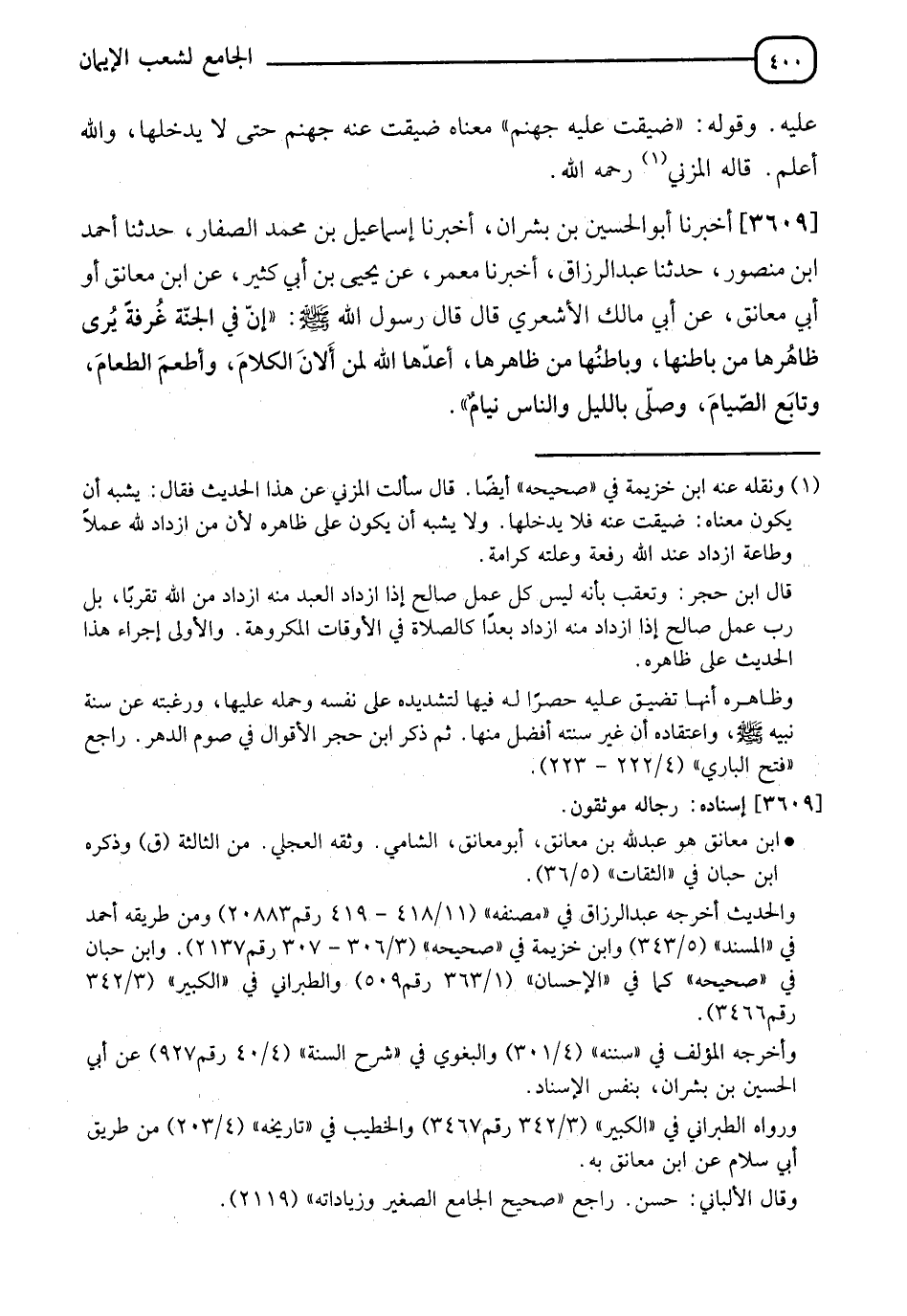 3609 - أَخْبَرَنَا أَبُو الْحُسَيْنِ بْنُ بِشْرانَ، أَخْبَرَنَا إِسْمَاعِيلُ بْنُ مُحَمَّدٍ الصَّفَّارُ، حَدَّثَنَا أَحْمَدُ بْنُ مَنْصُورٍ، حَدَّثَنَا عَبْدُ الرَّزَّاقِ، أَخْبَرَنَا مَعْمَرٌ، عَنْ يَحْيَى بْنِ أَبِي كَثِيرٍ، عَنِ ابْنِ مُعَانِقٍ، أَوْ أَبِي مُعَانِقٍ، عَنْ أَبِي مَالِكٍ الْأَشْعَرِيِّ، قَالَ: قَالَ رَسُولُ اللهِ صَلَّى اللَّهُ عَلَيْهِ وَسَلَّمَ: " إِنَّ §فِي الْجَنَّةِ غُرْفَةً يُرَى ظَاهِرُهَا مِنْ بَاطِنِهَا وَبَاطِنُهَا مِنْ ظَاهِرِهَا أَعَدَّهَا اللهُ لِمَنْ أَلَانَ الْكَلَامَ، وَأَطْعَمَ الطَّعَامَ، وَتَابَعَ الصِّيَامَ، وَصَلَّى بِاللَّيْلِ وَالنَّاسُ نِيَامٌ "