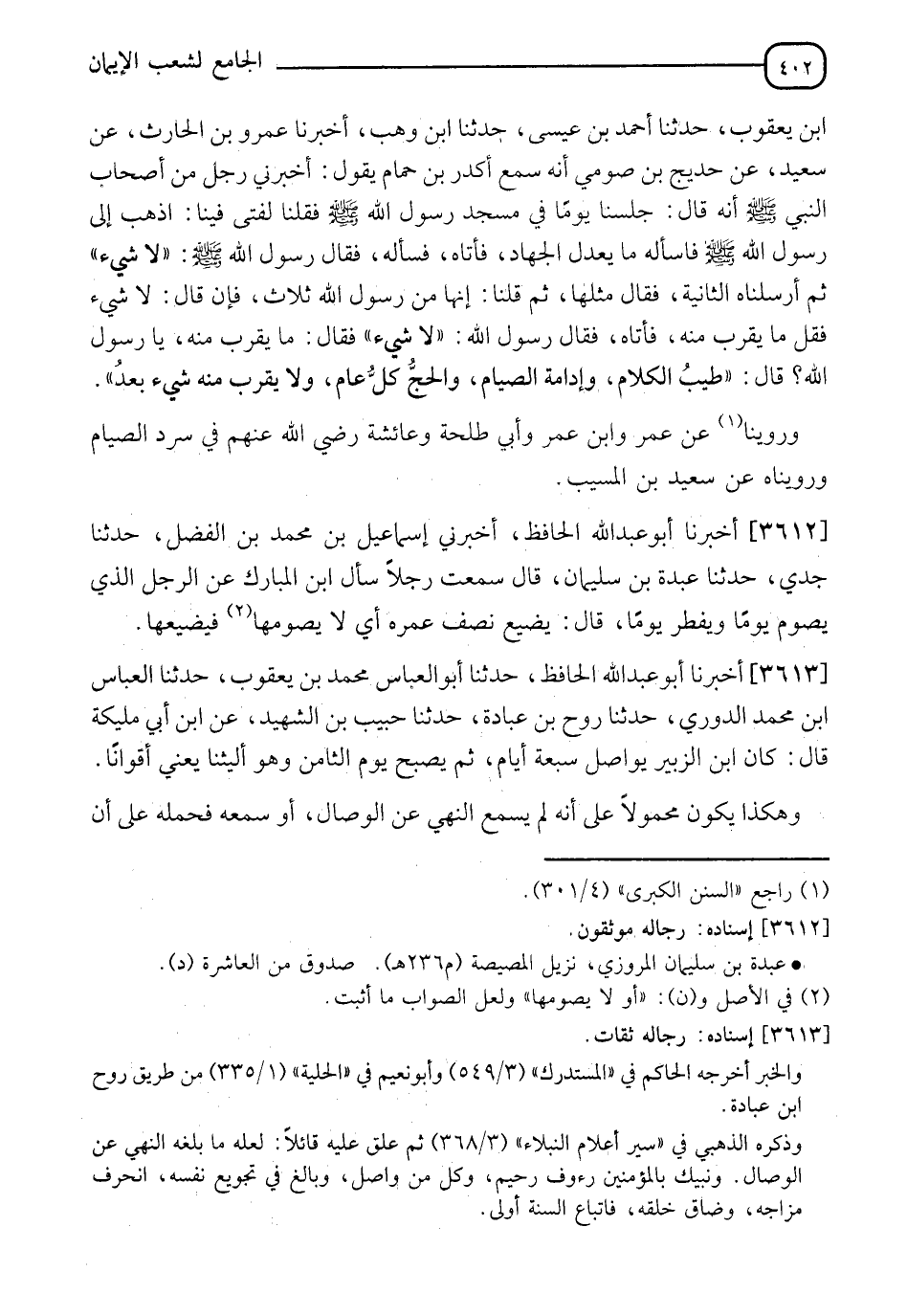 3613 - أَخْبَرَنَا أَبُو عَبْدِ اللهِ الْحَافِظُ، حَدَّثَنَا أَبُو الْعَبَّاسِ مُحَمَّدُ بْنُ يَعْقُوبَ، حَدَّثَنَا الْعَبَّاسُ بْنُ مُحَمَّدٍ الدُّورِيُّ، حَدَّثَنَا رَوْحُ بْنُ عِبَادَةَ، حَدَّثَنَا حَبِيبُ بْنُ الشَّهِيدِ، عَنِ ابْنِ أَبِي مُلَيْكَةَ، قَالَ: " كَانَ §ابْنُ الزُّبَيْرِ يُوَاصِلُ سَبْعَةَ أَيَّامٍ، ثُمَّ يُصْبِحُ يَوْمَ الثَّامِنِ وَهُوَ أَلْيَثُنَا يَعْنِي أَقْوَانَا، وَهَكذَا يَكُونُ مَحْمُولًا عَلَى أَنَّهُ لَمْ يَسْمَعِ النَّهْيَ عَنِ الْوِصَالِ أَوْ سَمْعِهِ فَحَمَلَهُ عَلَى أَنَّ -[403]- النَّبِيَّ صَلَّى اللَّهُ عَلَيْهِ وَسَلَّمَ إِنَّمَا نَهَى عَنْهُ إِبْقَاءً عَلَى أَصْحَابِهِ لَا عَلَى التَّحْرِيمِ كَمَا نَهَى عَنْ صَوْمِ الدَّهْرِ كَذَلِكَ لَا عَلَى التَّحْرِيمِ، وَاللهُ أَعْلَمُ "