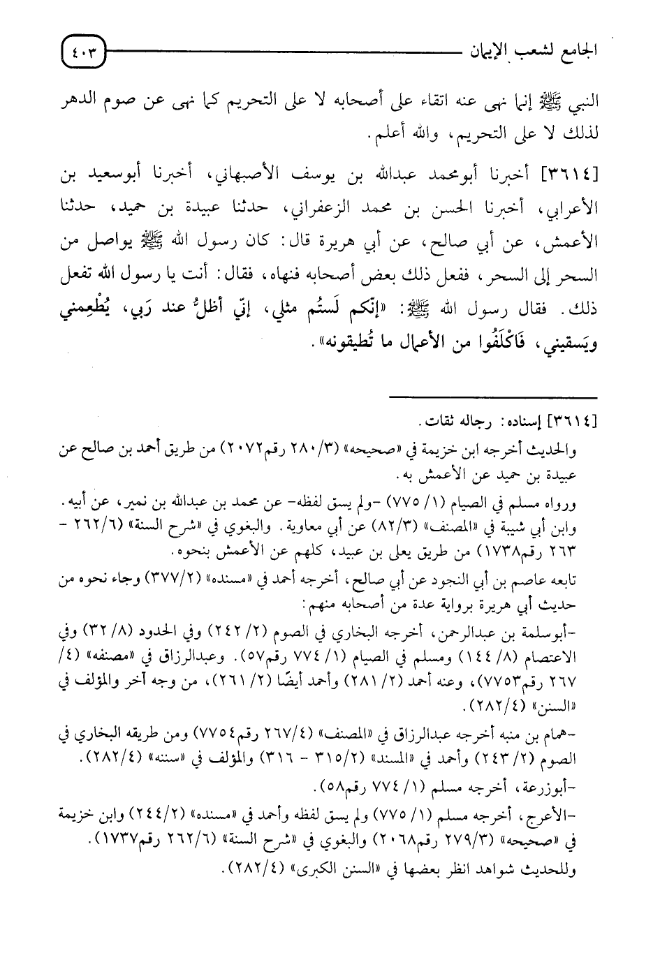 3614 - أَخْبَرَنَا أَبُو مُحَمَّدٍ عَبْدُ اللهِ بْنُ يُوسُفَ الْأَصْبَهَانِيُّ، أَخْبَرَنَا أَبُو سَعِيدِ بْنُ الْأَعْرَابِيِّ، أَخْبَرَنَا الْحَسَنُ بْنُ مُحَمَّدٍ الزَّعْفَرَانِيُّ، حَدَّثَنَا عَبِيدَةُ بْنُ حُمَيْدٍ، حَدَّثَنَا الْأَعْمَشُ، عَنْ أَبِي صَالِحٍ، عَنْ أَبِي هُرَيْرَةَ، قَالَ: كَانَ رَسُولُ اللهِ صَلَّى اللَّهُ عَلَيْهِ وَسَلَّمَ يُوَاصِلُ مِنَ السَّحَرِ إِلَى السَّحَرِ، فَفَعَلَ ذَلِكَ بَعْضُ أَصْحَابِهِ فَنَهَاهُ، فَقَالَ: أَنْتَ يَا رَسُولَ اللهِ تَفْعَلُ ذَلِكَ، فَقَالَ رَسُولُ اللهِ صَلَّى اللَّهُ عَلَيْهِ وَسَلَّمَ: " §إِنَّكُمْ لَسْتُمْ مِثْلِي، إِنِّي أَظَلُّ عِنْدَ رَبِّي يُطْعِمُنِي وَيَسْقِينِي فَاكْلَفُوا مِنَ الْأَعْمَالِ مَا تُطِيقُونَهُ "