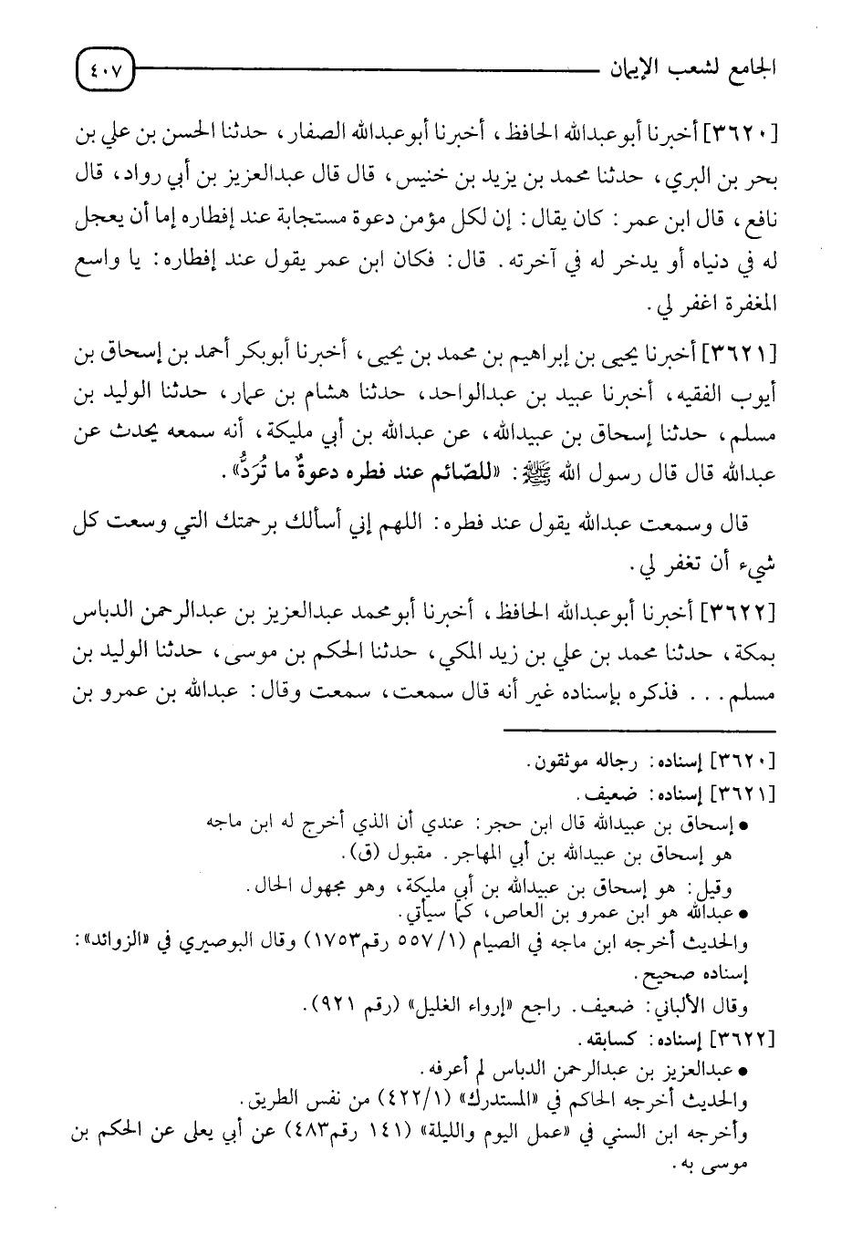 3620 - أَخْبَرَنَا أَبُو عَبْدِ اللهِ الْحَافِظُ، أَخْبَرَنَا أَبُو عَبْدِ اللهِ الصَّفَّارُ، حَدَّثَنَا الْحَسَنُ بْنُ عَلِيِّ بْنِ بَحْرِ بْنِ البَرِّىِّ، حَدَّثَنَا مُحَمَّدُ بْنُ يَزِيدَ بْنِ خُنَيْسٍ، قَالَ: قَالَ عَبْدُ الْعَزِيزِ بْنُ أَبِي رَوَّادٍ: قَالَ نَافِعٌ: قَالَ ابْنُ عُمَرَ: " كَانَ يُقَالُ إِنَّ §لِكُلِّ مُؤْمِنٍ دَعْوَةً مُسْتَجَابَةً عِنْدَ إِفْطَارِهِ، إِمَّا أَنْ يُعَجَّلَ لَهُ فِي دُنْيَاهُ، أَوْ يُدَّخَرَ لَهُ فِي آخِرَتِهِ ". قَالَ: فَكَانَ ابْنُ عُمَرَ يَقُولُ عِنْدَ إِفْطَارِهِ: " يَا وَاسِعَ الْمَغْفِرَةِ اغْفِرْ لِي "