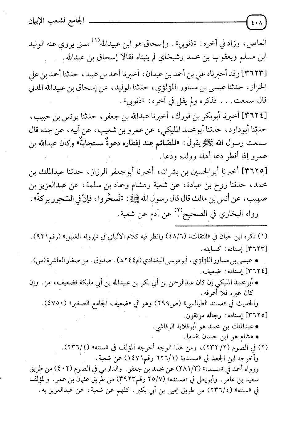3625 - أَخْبَرَنَا أَبُو الْحُسَيْنِ بْنُ بِشْرَانَ، أَخْبَرَنَا أَبُو جَعْفَرٍ الرَّزَّازُ، حَدَّثَنَا عَبْدُ الْمَلِكِ بْنُ مُحَمَّدٍ، حَدَّثَنَا رَوْحُ بْنُ عُبَادَةَ، عَنْ شُعْبَةَ، وَهِشَامٍ، وَحَمَّادِ بْنِ سَلَمَةَ، عَنْ عَبْدِ الْعَزِيزِ بْنِ صُهَيْبٍ، عَنْ أَنَسِ بْنِ مَالِكٍ، قَالَ: قَالَ رَسُولُ اللهِ صَلَّى اللَّهُ عَلَيْهِ وَسَلَّمَ: §" تَسَحَّرُوا فَإِنَّ فِي السُّحُورِ بَرَكَةً ". رَوَاهُ الْبُخَارِيُّ فِي الصَّحِيحِ عَنْ آدَمَ، عَنْ شُعْبَةَ، -[409]- وَأَخْرَجَهُ مُسْلِمٌ مِنْ وَجْهٍ آخَرَ عَنْ عَبْدِ الْعَزِيزِ