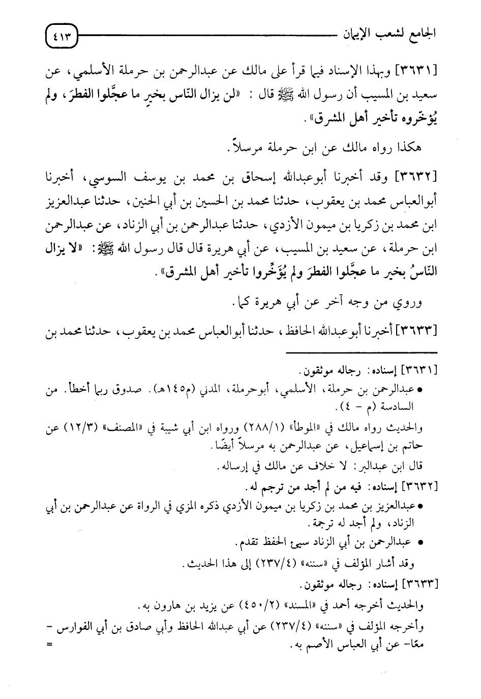 3632 - أَخْبَرَنَا أَبُو عَبْدِ اللهِ إِسْحَاقُ بْنُ مُحَمَّدِ بْنِ يُوسُفَ السُّوسِيُّ، أَخْبَرَنَا أَبُو الْعَبَّاسِ مُحَمَّدُ بْنُ يَعْقُوبَ، حَدَّثَنَا مُحَمَّدُ بْنُ الْحُسَيْنِ بْنِ أَبِي الْحُنَيْنِ، حَدَّثَنَا عَبْدُ الْعَزِيزِ بْنُ مُحَمَّدِ بْنِ زَكَرِيَّا بْنِ مَيْمُونٍ الْأَزْدِيُّ، حَدَّثَنَا عَبْدُ الرَّحْمَنِ بْنُ أَبِي الزِّنَادِ، عَنْ عَبْدِ الرَّحْمَنِ بْنِ حَرْمَلَةَ، عَنْ سَعِيدِ بْنِ الْمُسَيِّبِ، عَنْ أَبِي هُرَيْرَةَ، قَالَ: قَالَ رَسُولُ اللهِ صَلَّى اللَّهُ عَلَيْهِ وَسَلَّمَ: " §لَا يَزَالُ النَّاسُ بِخَيْرٍ مَا عَجَّلُوا الْفِطْرَ، وَلَمْ يُؤَخِّرُوا تَأْخِيرَ أَهْلِ الْمَشْرِقِ ". " وَرُوِيَ مِنْ وَجْهٍ آخَرَ عَنْ أَبِي هُرَيْرَةَ "