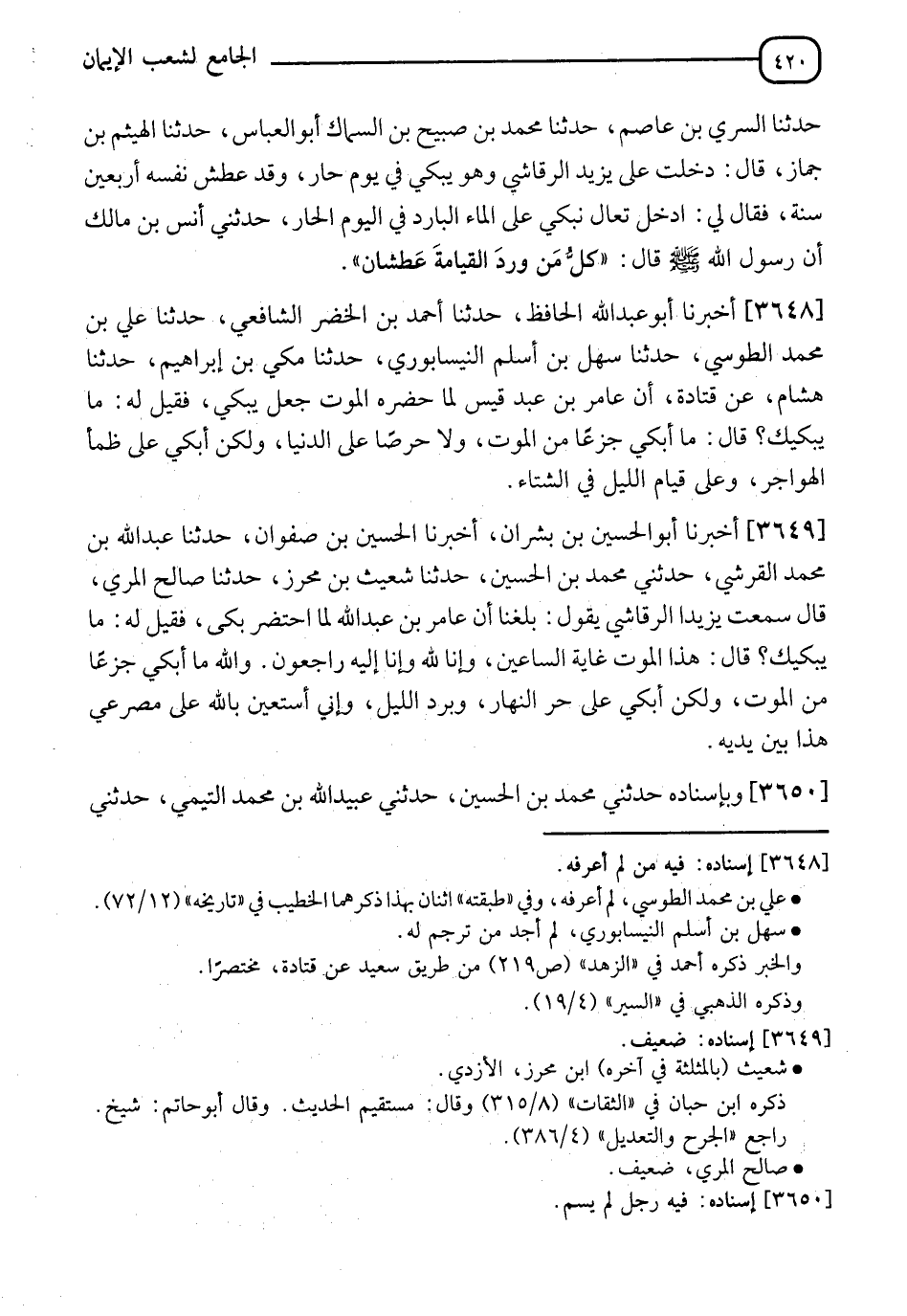 3649 - أَخْبَرَنَا أَبُو الْحُسَيْنِ بْنُ بِشْرَانَ، أَخْبَرَنَا الْحُسَيْنُ بْنُ صَفْوَانَ، حَدَّثَنَا عَبْدُ اللهِ بْنُ مُحَمَّدٍ الْقُرَشِيُّ، حَدَّثَنِي مُحَمَّدُ بْنُ الْحُسَيْنِ، حَدَّثَنَا شُعَيْبُ بْنُ مُحَرَزٍ، حَدَّثَنَا صَالِحٌ الْمُرِّيُّ، قَالَ: سَمِعْتُ يَزِيدَ الرَّقَاشِيَّ، يَقُولُ: بَلَغَنَا أَنَّ عَامِرَ بْنَ عَبْدِ اللهِ، لَمَّا احْتُضِرَ بَكَى، فَقِيلَ لَهُ: مَا يُبْكِيكَ؟، قَالَ: " هَذَا الْمَوْتُ غَايَةُ السَّاعِينَ، وَإِنَّا لِلَّهِ وَإِنَّا إِلَيْهِ رَاجِعُونَ، وَاللهِ §مَا أَبْكِي جَزَعًا مِنَ الْمَوْتِ، وَلَكِنِّي أَبْكِي عَلَى حَرِّ النَّهَارِ وَبَرْدِ اللَّيْلِ، وَإِنِّي أَسْتَعِينُ بِاللهِ عَلَى مَصْرَعِي هَذَا بَيْنَ يَدَيْهِ "