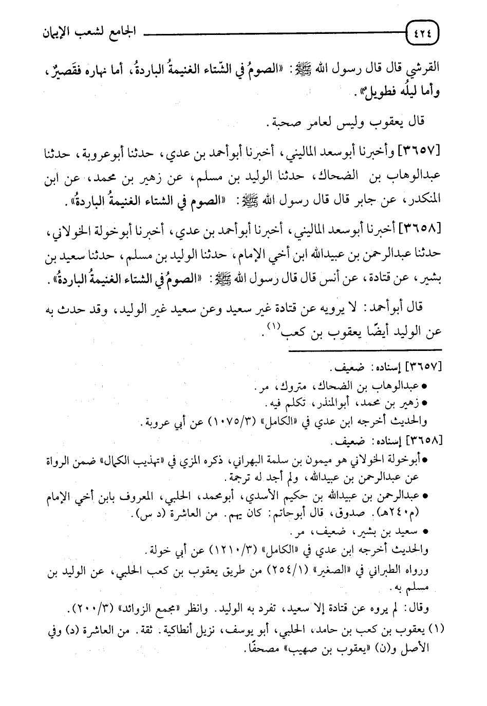 3658 - أَخْبَرَنَا أَبُو سَعْدٍ الْمَالِينِيُّ، أَخْبَرَنَا أَبُو أَحْمَدَ بْنُ عَدِيٍّ، أَخْبَرَنَا أَبُو خَوْلَةَ الْخَوْلَانِيُّ، حَدَّثَنَا عَبْدُ الرَّحْمَنِ بْنُ عُبَيْدِ اللهِ ابْنُ أَخِي الْإِمَامِ، حَدَّثَنَا الْوَلِيدُ بْنُ مُسْلِمٍ، حَدَّثَنَا سَعِيدُ بْنُ بَشِيرٍ، عَنْ قَتَادَةَ، عَنْ أَنَسٍ، قَالَ: قَالَ رَسُولُ اللهِ صَلَّى اللَّهُ عَلَيْهِ وَسَلَّمَ: §" الصَّوْمُ فِي الشِّتَاءِ الْغَنِيمَةُ الْبَارِدَةُ ". قَالَ أَبُو أَحْمَدَ: " لَا يَرْوِيهِ عَنْ قَتَادَةَ غَيْرُ سَعِيدٍ، وَعَنْ سَعِيدٍ غَيْرُ الْوَلِيدِ، وَقَدْ حَدَّثَ بِهِ عَنِ الْوَلِيدِ أَيْضًا يَعْقُوبُ بْنُ كَعْبٍ "
