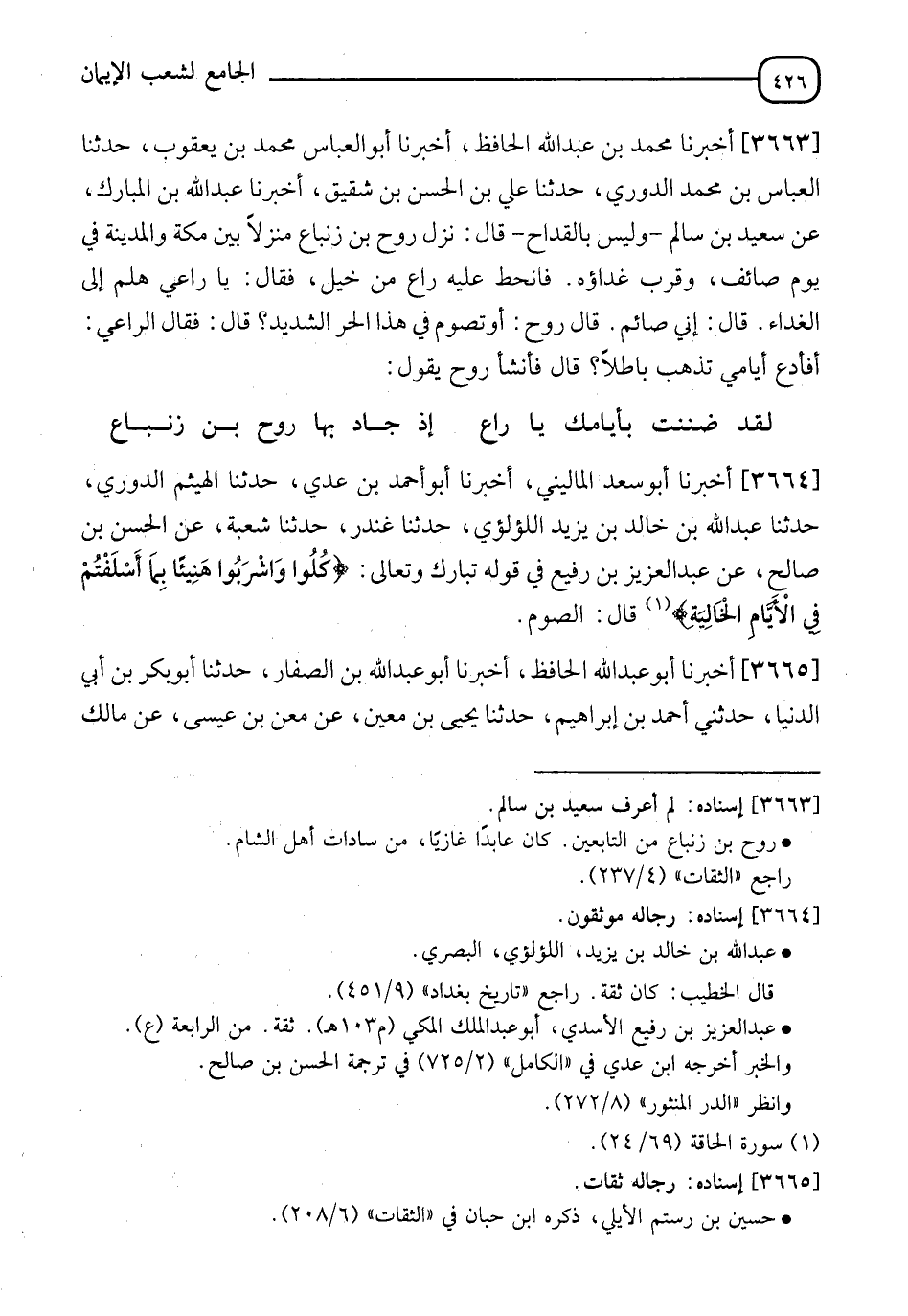 3663 - أَخْبَرَنَا مُحَمَّدُ بْنُ عَبْدِ اللهِ الْحَافِظُ، أَخْبَرَنَا أَبُو الْعَبَّاسِ مُحَمَّدُ بْنُ يَعْقُوبَ، حَدَّثَنَا الْعَبَّاسُ بْنُ مُحَمَّدٍ الدُّورِيُّ، حَدَّثَنَا عَلِيُّ بْنُ الْحَسَنِ بْنِ شَقِيقٍ، أَخْبَرَنَا عَبْدُ اللهِ بْنُ الْمُبَارَكِ، عَنْ سَعِيدِ بْنِ سَالِمٍ، وَلَيْسَ بالْقَدَّاحِ، قَالَ: نَزَلَ رَوْحُ بْنُ زِنْبَاعٍ مَنْزِلًا بَيْنَ مَكَّةَ، وَالْمَدِينَةِ فِي يَوْمٍ صَائِفٍ، وَقُرِّبَ غَدَاؤُهُ فَانْحَطَّ عَلَيْهِ رَاعٍ مِنْ خَيْلٍ، فَقَالَ: يَا رَاعِي هَلُمَّ إِلَى الْغَدَاءِ، قَالَ: إِنِّي صَائِمٌ، قَالَ رَوْحٌ:" §أَوَ تَصُومُ فِي هَذَا الْحَرِّ الشَّدِيدِ؟ "، قَالَ: فَقَالَ الرَّاعِي: أَفَأَدَعُ أَيَّامِي تَذْهَبُ بَاطِلًا؟ قَالَ: فَأَنْشَأَ رَوْحٌ يَقُولُ: