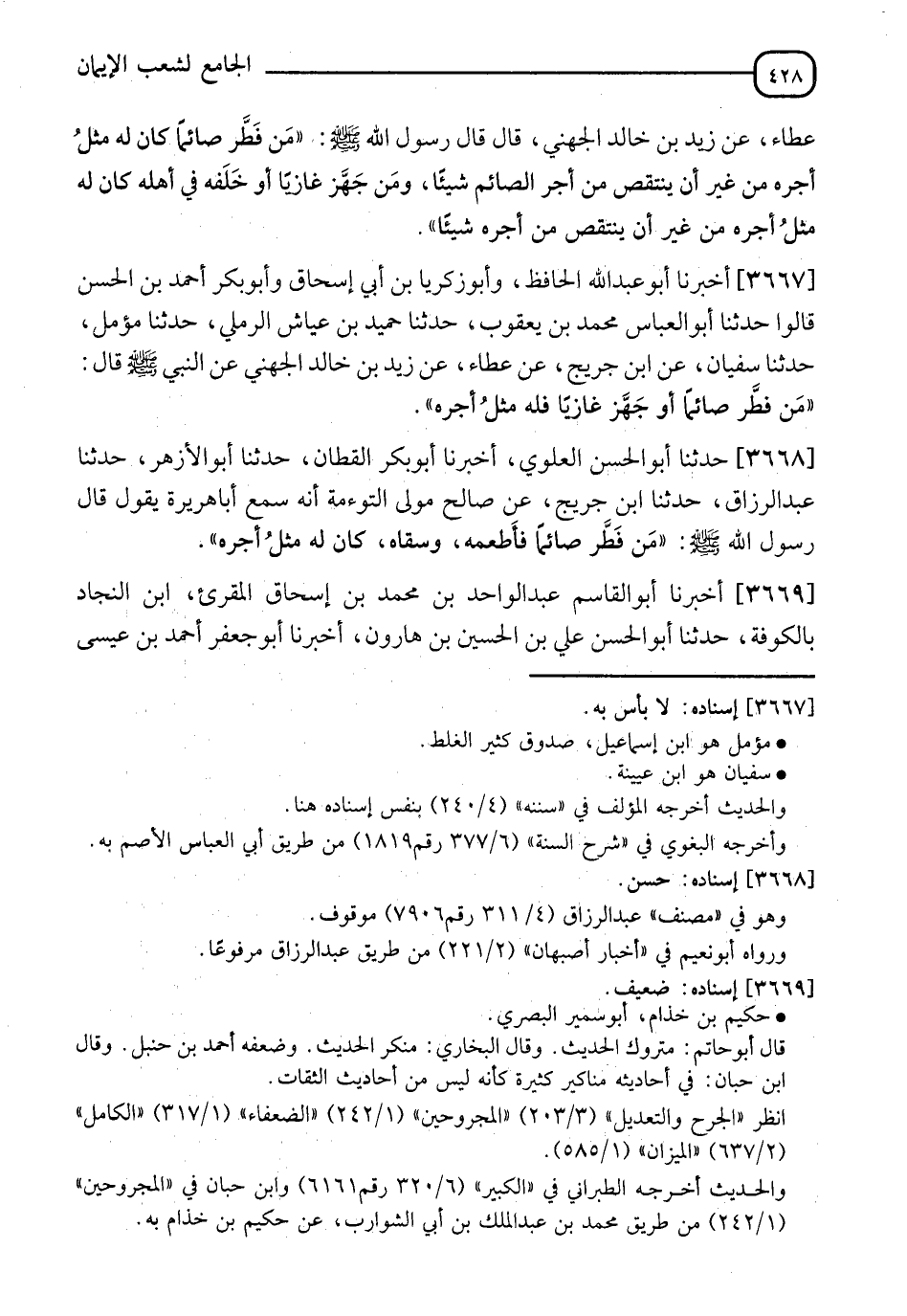 3667 - أَخْبَرَنَا أَبُو عَبْدِ اللهِ الْحَافِظُ، وَأَبُو زَكَرِيَّا بْنُ أَبِي إِسْحَاقَ، وَأَبُو بَكْرٍ أَحْمَدُ بْنُ الْحَسَنِ، قَالُوا: حَدَّثَنَا أَبُو الْعَبَّاسِ مُحَمَّدُ بْنُ يَعْقُوبَ، حَدَّثَنَا حُمَيْدُ بْنُ عَيَّاشٍ الرَّمْلِيُّ، حَدَّثَنَا مُؤَمَّلٌ، حَدَّثَنَا سُفْيَانُ، عَنِ ابْنِ جُرَيْجٍ، عَنْ عَطَاءٍ، عَنْ زَيْدِ بْنِ خَالِدٍ الْجُهَنِيِّ، عَنِ النَّبِيِّ صَلَّى اللَّهُ عَلَيْهِ وَسَلَّمَ قَالَ: §" مَنْ فَطَّرَ صَائِمًا أَوْ جَهَّزَ غَازِيًا فَلَهُ مِثْلَ أَجْرِهِ "