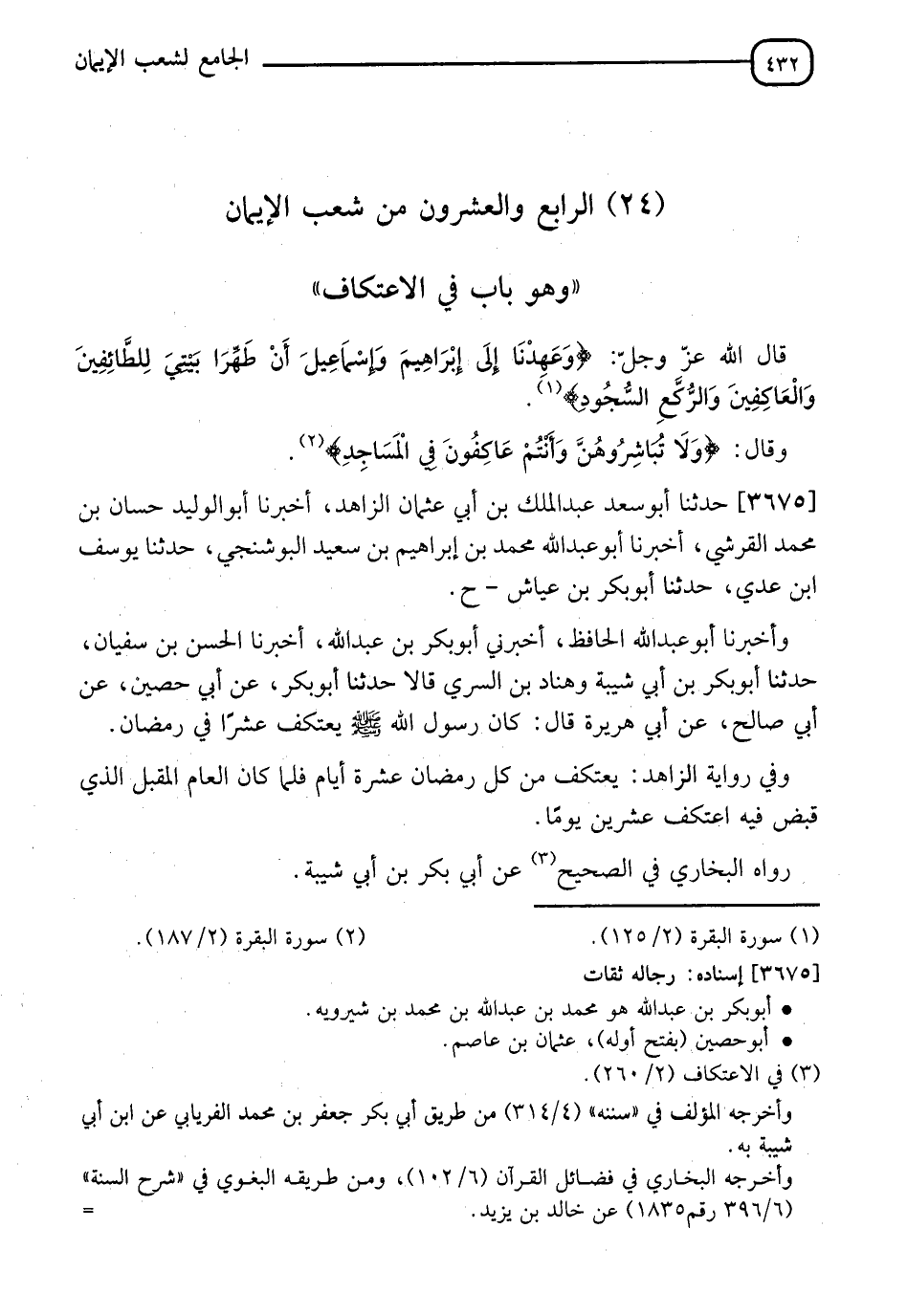 §الرَّابِعِ وَالْعِشْرُونَ مِنْ شُعَبِ الْإِيمَانِ وَهُوَ بَابٌ فِي الِاعْتِكَافِ قَالَ اللهُ عَزَّ وَجَلَّ: {وَعَهِدْنَا إِلَى إِبْرَاهِيمَ وَإِسْمَاعِيلَ أَنْ طَهِّرَا بَيْتِيَ لِلطَّائِفِينَ وَالْعَاكِفِينَ وَالرُّكَّعِ السُّجُودِ} [البقرة: 125] وَقَالَ: {وَلَا تُبَاشِرُوهُنَّ وَأَنْتُمْ عَاكِفُونَ فِي الْمَسَاجِدِ} [البقرة: 187]