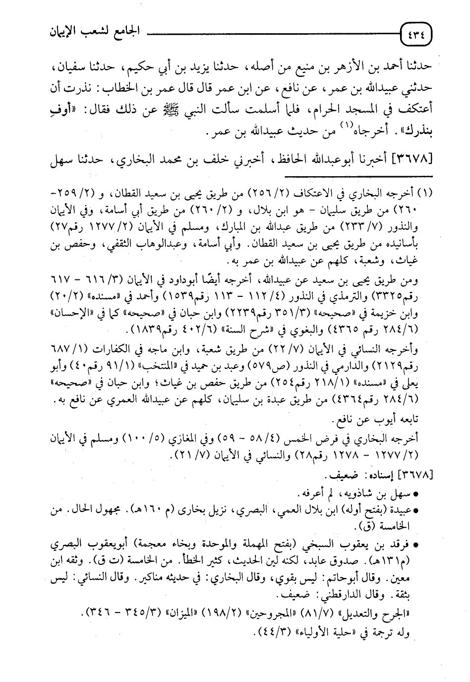 3678 - أَخْبَرَنَا أَبُو عَبْدِ اللهِ الْحَافِظُ، أَخْبَرَنِي خَلَفُ بْنُ مُحَمَّدٍ الْبُخَارِيُّ، حَدَّثَنَا سَهْلُ -[435]- بْنُ شَاذَوَيْهِ، حَدَّثَنَا إِسْحَاقُ بْنُ حَمْزَةَ، حَدَّثَنَا عِيسَى بْنُ مُوسَى، عَنْ عُبَيْدَةَ بْنِ بِلَالٍ الْعَمِّيِّ الْبُخَارِيِّ، عَنْ فَرْقَدٍ السَّبَخِيِّ، عَنْ سَعِيدِ بْنِ جُبَيْرٍ، عَنِ ابْنِ عَبَّاسٍ، عَنِ النَّبِيِّ صَلَّى اللَّهُ عَلَيْهِ وَسَلَّمَ أَنَّهُ قَالَ فِي الْمُعْتَكِفِ: " §إنَّهُ مُعْتَكِفُ الذُّنُوبِ، وَيَجْرِي لَهُ مِنَ الْأَجْرِ كَأَجْرِ عَامِلِ الْحَسَنَاتِ كُلِّهَا ". وَقَدْ رَوَاهُ أَيْضًا أَبُو زُرْعَةَ الرَّازِيُّ، عَنْ مُحَمَّدِ بْنِ أُمَيَّةَ، عَنْ عِيسَى بْنِ مُوسَى غُنْجَارٍ، وَهُوَ يَتَفَرَّدُ بِإِسْنَادِهِ هَذَا وَفِيهِ ضَعْفٌ، وَاللهُ أَعْلَمُ