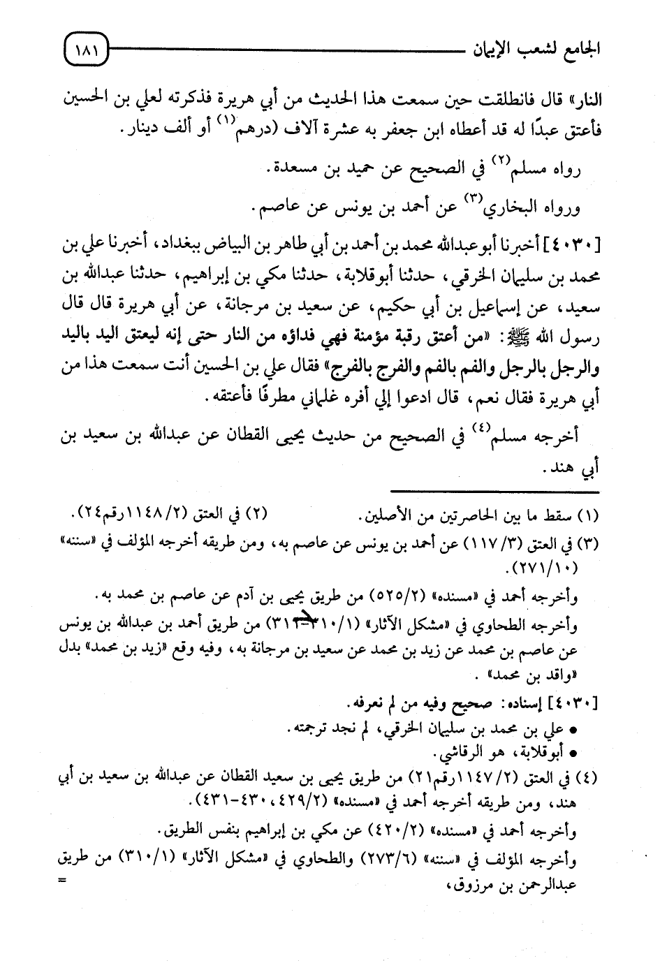 4030 - أَخْبَرَنَا أَبُو عَبْدِ اللهِ مُحَمَّدُ بْنُ أَحْمَدَ بْنِ أَبِي طَاهِرِ بْنِ الْبَيَاضِ، بِبَغْدَادَ، أَخْبَرَنَا عَلِيُّ بْنُ مُحَمَّدِ بْنِ سُلَيْمَانَ الْخَرَقِيُّ، حَدَّثَنَا أَبُو قِلَابَةَ، حَدَّثَنَا مَكِّيُّ بْنُ إِبْرَاهِيمَ، حَدَّثَنَا عَبْدُ اللهِ بْنُ سَعِيدٍ، عَنْ إِسْمَاعِيلَ بْنِ أَبِي حَكِيمٍ، عَنْ سَعِيدِ بْنِ مَرْجَانَةَ، عَنْ أَبِي هُرَيْرَةَ، قَالَ: قَالَ رَسُولُ اللهِ صَلَّى اللَّهُ عَلَيْهِ وَسَلَّمَ: §" مَنْ أَعْتَقَ رَقَبَةً مُؤْمِنَةً فَهِيَ فِدَاؤُهُ مِنَ النَّارِ حَتَّى أَنَّهُ لَيُعْتَقُ الْيَدُ بِالْيَدِ، وَالرِّجْلُ بِالرَّجْلِ، وَالْفَمُ بالْفَمِ، وَالْفَرْجُ بِالْفَرَجِ " فَقَالَ عَلِيُّ بْنُ الْحُسَيْنِ: أَنْتَ سَمِعْتَ هَذَا مِنْ أَبِي هُرَيْرَةَ، فَقَالَ: نَعَمْ، قَالَ: " ادْعُ إِلَيَّ أَفْرَهَ غِلْمَانِي مُطَرِّفًا. فَأَعْتَقَهُ. أَخْرَجَهُ مُسْلِمٌ فِي الصَّحِيحِ، مِنْ حَدِيثِ يَحْيَى بْنِ الْقَطَّانِ، عَنْ عَبْدِ اللهِ بْنِ سَعِيدِ بْنِ أَبِي هِنْدَ