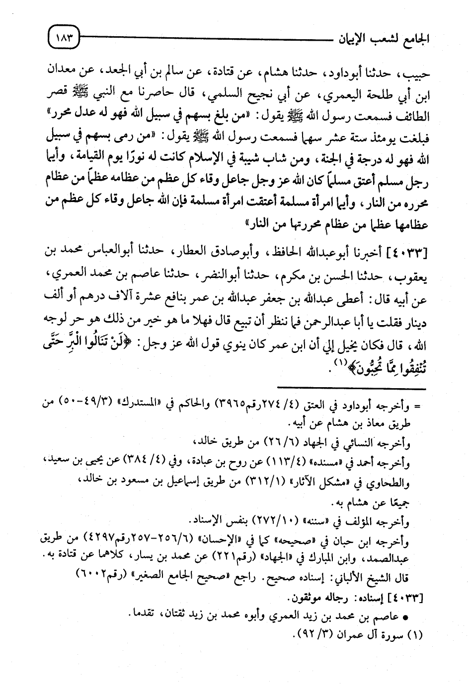 4033 - أَخْبَرَنَا أَبُو عَبْدِ اللهِ الْحَافِظُ، وَأَبُو صَادِقٍ الْعَطَّارُ، حَدَّثَنَا أَبُو الْعَبَّاسِ مُحَمَّدُ بْنُ يَعْقُوبَ، حَدَّثَنَا الْحَسَنُ بْنُ مَكْرَمٍ، حَدَّثَنَا أَبُو النَّضْرِ، حَدَّثَنَا عَاصِمُ بْنُ مُحَمَّدٍ الْعُمَرِيُّ، عَنْ أَبِيهِ، قَالَ: أَعْطَى عَبْدُ اللهِ بْنُ جَعْفَرٍ عَبْدَ اللهِ بْنَ عُمَرَ بِنَافِعٍ عَشَرَةَ آلَافِ دِرْهَمٍ - أَوْ أَلْفَ دِينَارٍ - فقلت يا أَبَا عَبْدِ الرَّحْمَنِ فَمَا تَنْتَظِرُ أَنْ تَبِيعَ؟ قَالَ: فَهَلَّا مَا هُوَ خَيْرٌ مِنْ ذَلِكَ: هُوَ حُرٌّ لِوَجْهِ اللهِ. قَالَ: فَكَانَ يُخَيَّلُ إِلَيَّ أَنَّ ابْنَ عُمَرَ كَانَ يَنْوِي قَوْلَ اللهِ عَزَّ وَجَلَّ: {§لَنْ تَنَالُوا الْبِرَّ حَتَّى تُنْفِقُوا مِمَّا تُحِبُّونَ} [آل عمران: 92]