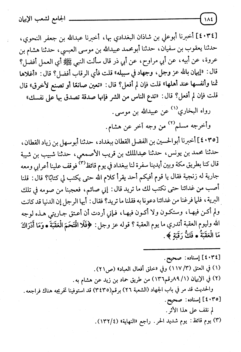 4035 - أَخْبَرَنَا أَبُو الْحُسَيْنِ بْنُ الْفَضْلِ الْقَطَّانُ، بِبَغْدَادَ، حَدَّثَنَا أَبُو سَهْلِ بْنُ زِيَادٍ الْقَطَّانُ، حَدَّثَنَا مُحَمَّدُ بْنُ يُونُسَ، حَدَّثَنَا عَبْدُ الْمَلَكِ بْنُ قَرِيبٍ الْأَصْمَعِيُّ، حَدَّثَنَا شَبِيبُ بْنُ شَيْبَةَ، قَالَ: " كُنَّا بِطَرِيقِ مَكَّةَ وَبَيْنَ أَيْدِينَا سُفْرَةٌ لَنَا بِبَغْدَادَ فِي يَوْمٍ قَائِظٍ، فَوَقَفَ عَلَيْنَا أَعْرَابِيٌّ، وَمَعَهُ جَارِيَةٌ لَهُ زِنْجِيَّةٌ، فَقَالَ: يَا قَوْمُ، أَفِيكُمْ أَحَدٌ يَقْرَأُ كَلَامَ اللهِ حَتَّى يَكْتُبَ لِي كِتَابًا؟، قَالَ: قُلْنَا: أَصِبْ مِنْ غَدَائِنَا حَتَّى نَكْتُبَ لَكَ مَا تُرِيدُ. قَالَ: إِنِّي صَائِمٌ، فَعَجِبْنَا مِنْ صَوْمِهِ فِي تِلْكَ الْبَرِيَّةِ، فَلَمَّا فَرَغْنَا مِنْ غَدَائِنَا دَعَوْنَا بِهِ، فَقُلْنَا: مَا تُرِيدُ؟، فَقَالَ: أَيُّهَا الرَّجُلُ إِنَّ الدُّنْيَا قَدْ كَانَتْ، وَلَمْ أَكُنْ فِيهَا، وَسَتَكُونُ وَلَا أَكُونُ فِيهَا، فَإِنِّي §أَرَدْتُ أَنْ أَعْتِقَ جَارِيَتِي هَذِهِ لِوَجْهِ اللهِ، وَلِيَوْمِ الْعَقَبَةِ، أَتَدْرِي مَا يَوْمُ الْعَقَبَةِ؟، قَوْلُهُ عَزَّ وَجَلَّ: {فَلَا اقْتَحَمَ الْعَقَبَةَ وَمَا أَدْرَاكَ مَا الْعَقَبَةُ فَكُّ رَقَبَةٍ} [البلد: 12]-[185]- فَاكْتُبْ مَا أَقُولُ لَكَ، وَلَا تَزِيدَنَّ عَلَيَّ حَرْفًا. هَذِهِ فُلَانَةٌ خَادِمُ فُلَانٍ، قَدْ أَعْتَقَهَا لِوَجْهِ اللهِ وَلِيَوْمِ الْعَقَبَةِ ". قَالَ شَبِيبُ: " فَقَدِمَتُ الْبَصْرَةَ فَأَتَيْتُ بَغْدَادَ فَحَدَّثْتُ بِهَذَا الْحَدِيثِ الْمَهْدِيَّ، قَالَ: " مِائَةُ نَسَمَةٍ يُعْتَقُ عَلَى عُهْدَةِ الْأَعْرَابِيِّ "