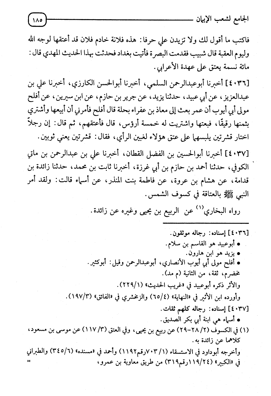 4037 - أَخْبَرَنَا أَبُو الْحُسَيْنِ بْنُ الْفَضْلِ الْقَطَّانُ، أَخْبَرَنَا عَلِيُّ بْنُ عَبْدِ الرَّحْمَنِ بْنُ مَاتِي الْكُوفِيُّ، حَدَّثَنَا أَحْمَدُ بْنُ حَازِمِ بْنِ أَبِي عُرْوَةَ، أَخْبَرَنَا ثَابِتُ بْنُ مُحَمَّدٍ، حَدَّثَنَا زَائِدَةُ بْنُ قُدَامَةَ، عَنْ هِشَامِ بْنِ عُرْوَةَ، عَنْ فَاطِمَةَ بِنْتِ الْمُنْذِرِ، عَنْ أَسْمَاءَ، قَالَتْ: " وَلَقَدْ §أَمْرَ النَّبِيُّ صَلَّى اللَّهُ عَلَيْهِ وَسَلَّمَ، بِالْعِتَاقة فِي كُسُوفِ الشَّمْسِ ". رَوَاهُ الْبُخَارِيُّ، عَنِ الرَّبِيعِ بْنِ يَحْيَى، وَغَيْرُهُ، عَنْ زَائِدَةَ