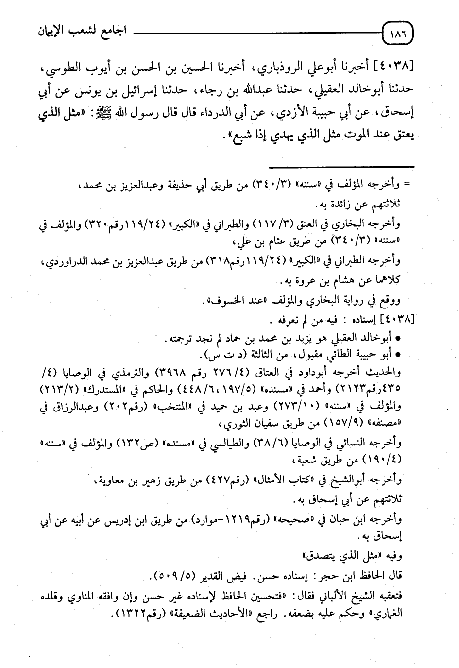 4038 - أَخْبَرَنَا أَبُو عَلِيٍّ الرُّوذْبَارِيُّ، أَخْبَرَنَا الْحُسَيْنُ بْنُ الْحَسَنِ بْنُ أَيُّوبَ الطُّوسِيُّ، حَدَّثَنَا أَبُو خَالِدٍ الْعُقَيْلِيُّ، حَدَّثَنَا عَبْدُ اللهِ بْنُ رَجَاءَ، حَدَّثَنَا إِسْرَائِيلُ بْنُ يُونُسَ، عَنْ أَبِي إِسْحَاقَ، عَنْ أَبِي حَبِيبَةَ الْأَزْدِيِّ، عَنْ أَبِي الدَّرْدَاءِ، قَالَ: قَالَ رَسُولُ اللهِ صَلَّى اللَّهُ عَلَيْهِ وَسَلَّمَ: §" مَثَلُ الَّذِي يُعْتِقُ عِنْدَ الْمَوْتِ مَثَلُ الَّذِي يَهْدِي إِذَا شَبِعَ "