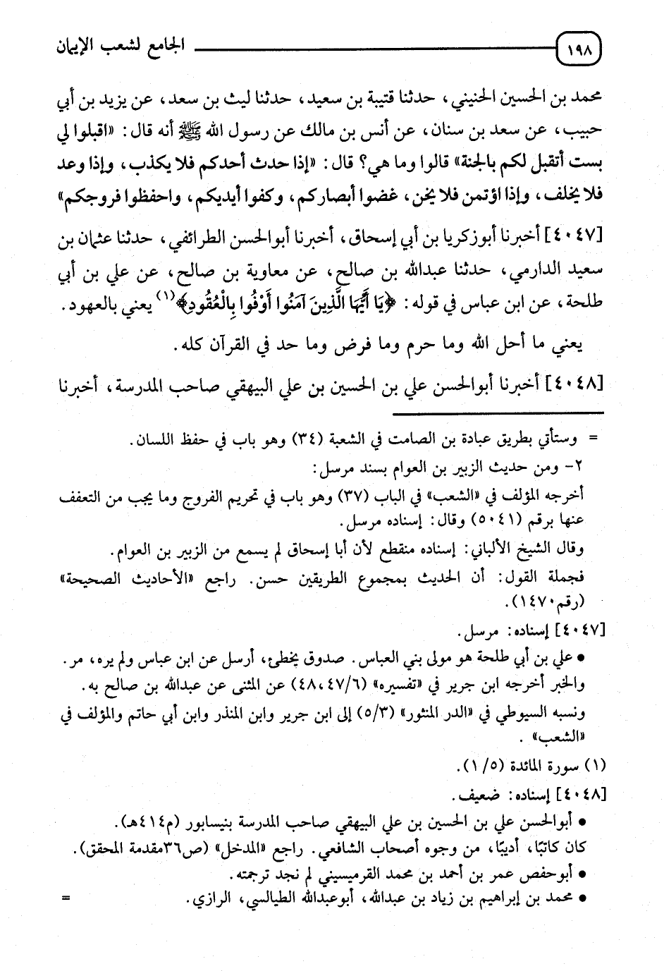4047 - أَخْبَرَنَا أَبُو زَكَرِيَّا بْنُ أَبِي إِسْحَاقَ، أَخْبَرَنَا أَبُو الْحَسَنِ الطَّرَائِفِيُّ، حَدَّثَنَا عُثْمَانُ بْنُ سَعِيدٍ الدَّارِمِيُّ، حَدَّثَنَا عَبْدُ اللهِ بْنُ صَالِحٍ، عَنْ مُعَاوِيَةَ بْنِ صَالِحٍ، عَنْ عَلِيِّ بْنِ أَبِي طَلْحَةَ، عَنِ ابْنِ عَبَّاسٍ، فِي قَوْلِهِ: {§يَا أَيُّهَا الَّذِينَ آمَنُوا أَوْفُوا بِالْعُقُودِ} [المائدة: 1]، " يَعْنِي بِالْعُهُودِ، يَعْنِي مَا أَحَلَّ اللهُ، وَمَا حَرَّمَ، وَمَا فَرْضَ، وَمَا حَدَّ فِي الْقُرْآنِ كُلِّهِ "