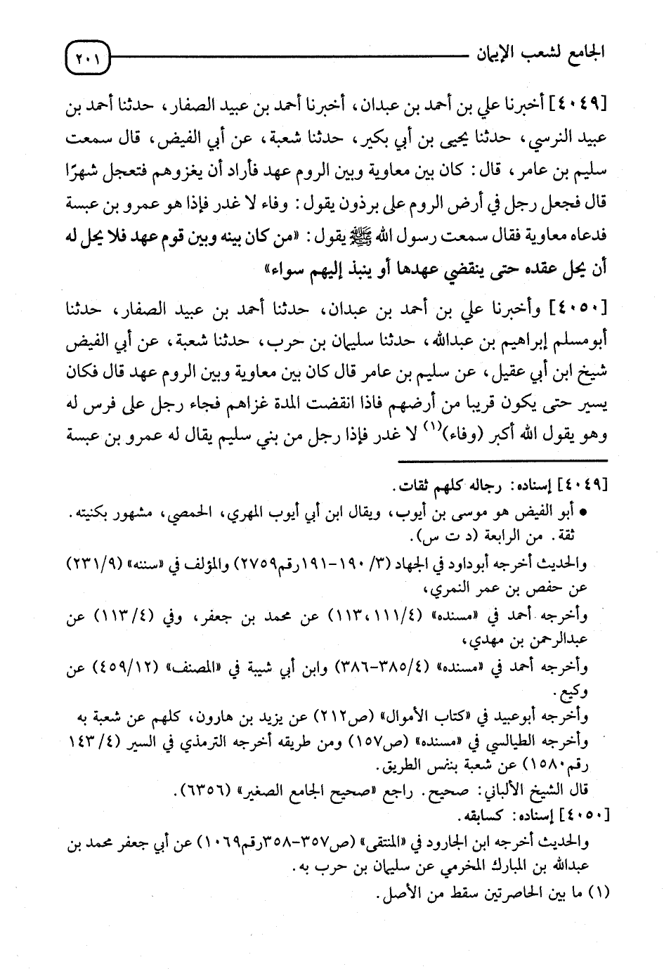 4049 - أَخْبَرَنَا عَلِيُّ بْنُ أَحْمَدَ بْنِ عَبْدَانَ، أخبرنا أَحْمَدُ بْنُ عُبَيْدِ الصَّفَّارُ، حَدَّثَنَا أَحْمَدُ بْنُ عُبَيْدِ اللهِ النَّرْسِيُّ، حَدَّثَنَا يَحْيَى بْنُ أَبِي بُكَيْرٍ، حَدَّثَنَا شُعْبَةُ، عَنْ أَبِي الْفَيْضِ، قَالَ: سَمِعْتُ سُلَيْمَ بْنَ عَامِرٍ، قَالَ: كَانَ بَيْنَ مُعَاوِيَةَ وَبَيْنَ الرُّومِ عَهْدٌ، فَأَرَادَ أَنْ يَغْزُوَهُمْ، فَتَعَجَّلَ شَهْرًا. قَالَ: فَجَعَلَ رَجُلٌ فِي أَرْضِ الرُّومِ عَلَى بِرْذَوْنٍ، يَقُولُ: وَفَاءٌ لَا غَدْرٌ. فَإِذَا هُوَ عَمْرُو بْنُ عَنْبَسَةَ، فَدَعَاهُ مُعَاوِيَةُ، فَقَالَ: سَمِعْتُ رَسُولَ اللهِ صَلَّى اللَّهُ عَلَيْهِ وَسَلَّمَ، يَقُولُ: " §مَنْ كَانَ بَيْنَهُ وَبَيْنَ قَوْمٍ عَهْدٌ، فَلَا يَحِلُّ لَهُ أَنْ يَحِلَّ عُقْدَةً حَتَّى يَنْقَضِي أَمَدُهَا أَوْ يُنْبِذُ إِلَيْهِمْ سَوَاءٌ "