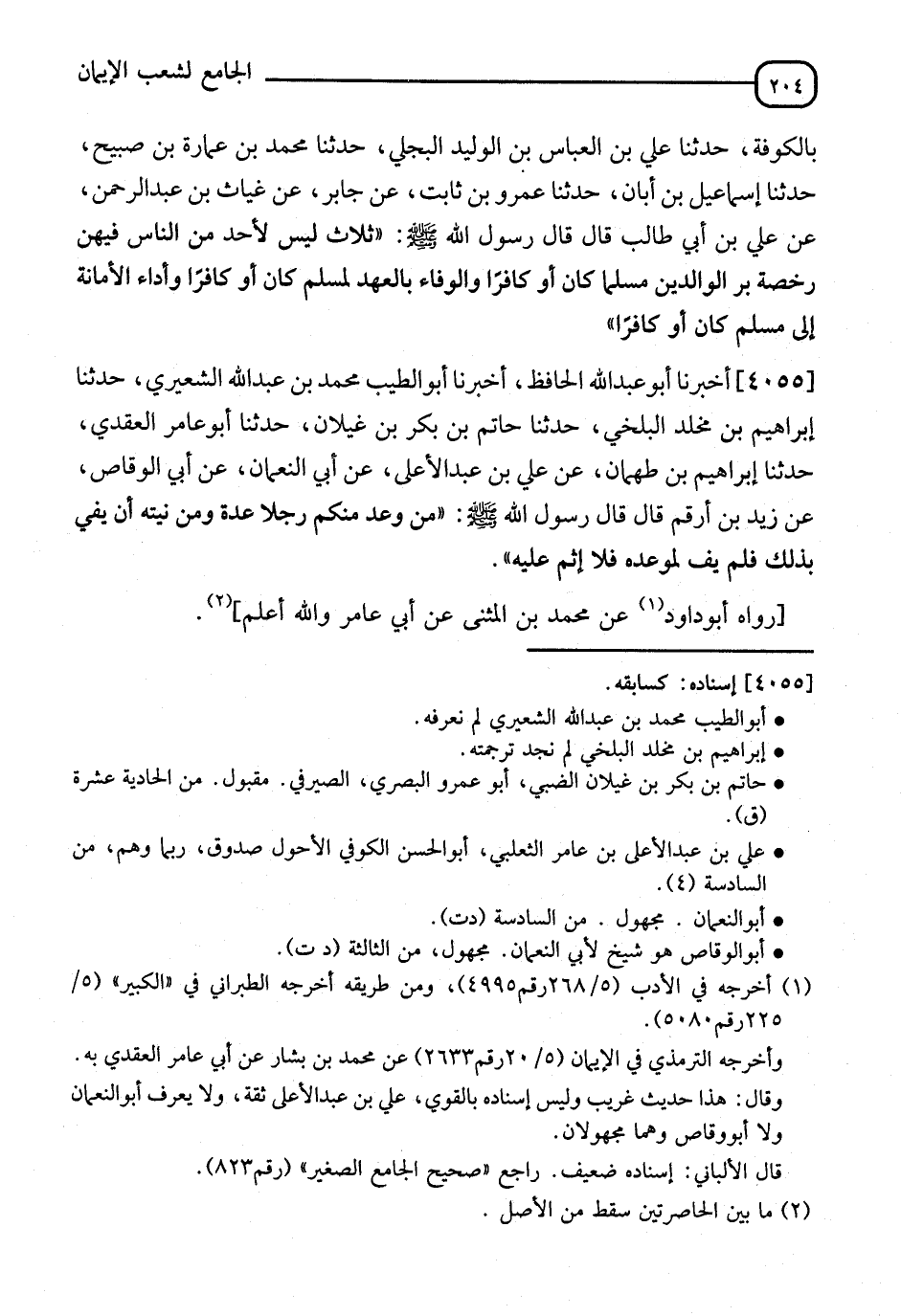 4055 - أَخْبَرَنَا أَبُو عَبْدِ اللهِ الْحَافِظُ، أَخْبَرَنَا أَبُو الطَّيِّبِ مُحَمَّدُ بْنُ عَبْدِ اللهِ الشَّعِيرِيُّ، حَدَّثَنَا إِبْرَاهِيمُ بْنُ مَخْلَدٍ الْبَلْخِيُّ، حَدَّثَنَا حَاتِمُ بْنُ بَكْرِ بْنِ غَيْلَانَ، حَدَّثَنَا أَبُو عَامِرٍ الْعَقَدِيُّ، حَدَّثَنَا إِبْرَاهِيمُ بْنُ طَهْمَانَ، عَنْ عَلِيِّ بْنِ عَبْدِ الْأَعْلَى، عَنْ أَبِي النُّعْمَانِ، عَنْ أَبِي الْوَقَّاصِ، عَنْ زَيْدِ بْنِ أَرْقَمَ، قَالَ: قَالَ رَسُولُ اللهِ صَلَّى اللَّهُ عَلَيْهِ وَسَلَّمَ: " §مَنْ وَعَدَ مِنْكُمْ رَجُلًا عِدَةً، وَمِنْ نِيَّتِهِ أَنْ يَفِي بِذَلِكَ فَلَمْ يَفِ لِمَوْعِدِهِ فَلَا إِثْمَ عَلَيْهِ ". رَوَاهُ أَبُو دَاوُدَ، عَنْ مُحَمَّدِ بْنِ الْمُثَنَّى، عَنْ أَبِي عَامِرٍ وَاللهُ أَعْلَمُ