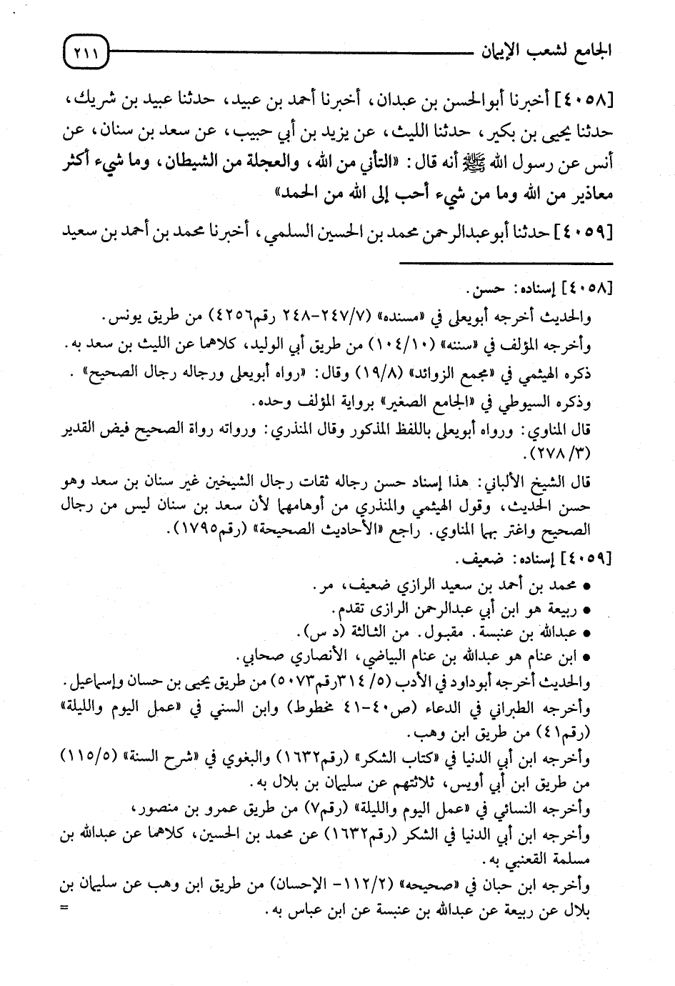 4058 - أَخْبَرَنَا أَبُو الْحَسَنِ بْنُ عَبْدَانَ، أَخْبَرَنَا أَحْمَدُ بْنُ عُبَيْدٍ، حَدَّثَنَا عُبَيْدُ بْنُ شَرِيكٍ، حَدَّثَنَا يَحْيَى بْنُ بُكَيْرٍ، حَدَّثَنَا اللَّيْثُ، عَنْ يَزِيدَ بْنِ أَبِي حَبِيبٍ، عَنْ سَعْدِ بْنِ سِنَانٍ، عَنْ أَنَسٍ، عَنْ رَسُولِ اللهِ صَلَّى اللَّهُ عَلَيْهِ وَسَلَّمَ أَنَّهُ، قَالَ: " §التَّأَنِّي مِنَ اللهِ، وَالْعَجَلَةُ مِنَ الشَّيْطَانِ، وَمَا شَيْءٌ أَكْثَرُ مَعَاذِيرَ مِنَ اللهِ وَمَا مِنْ شَيْءٍ أَحَبُّ إِلَى اللهِ مِنَ الْحَمْدِ "