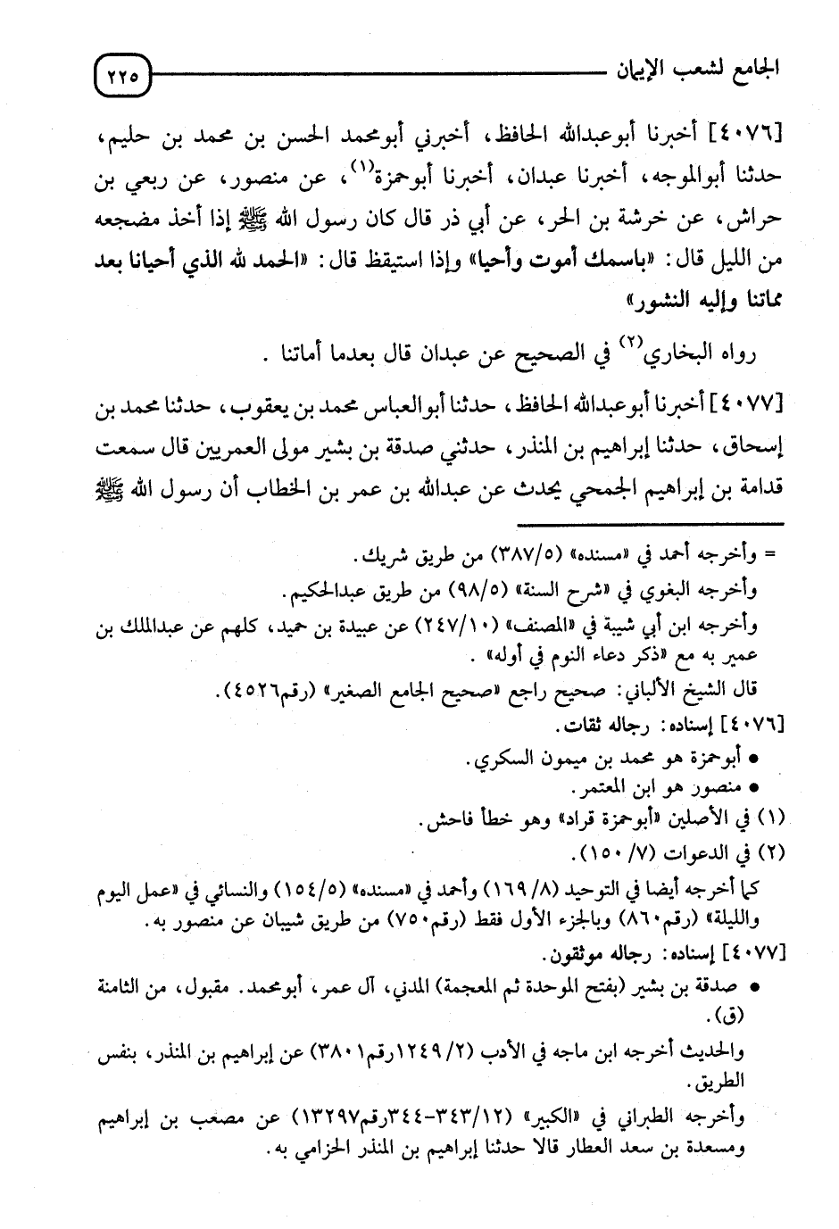4076 - أَخْبَرَنَا أَبُو عَبْدِ اللهِ الْحَافِظُ، أَخْبَرَنِي أَبُو مُحَمَّدٍ الْحَسَنُ بْنُ مُحَمَّدِ بْنِ حَلِيمٍ، حَدَّثَنَا أَبُو الْمَوْجَةِ، أَخْبَرَنَا عَبْدَانُ، أَخْبَرَنَا أَبُو حَمْزَةَ، عَنْ مَنْصُورٍ، عَنْ رِبْعِيِّ بْنِ حِرَاشٍ، عَنْ خَرَشَةَ بْنِ الْحُرِّ، عَنْ أَبِي ذَرٍّ، قَالَ: كَانَ رَسُولُ اللهِ صَلَّى اللَّهُ عَلَيْهِ وَسَلَّمَ إِذَا أَخَذَ مَضْجَعَهُ مِنَ اللَّيْلِ، قَالَ: " بِاسْمِكَ أَمُوتُ وَأَحْيَى ". وَإِذَا اسْتَيْقَظَ، قَالَ: §" الْحَمْدُ لِلَّهِ الَّذِي أَحْيَانَا بَعْدَ مَمَاتِنَا وَإِلَيْهِ النُّشُورِ ". رَوَاهُ الْبُخَارِيُّ فِي الصَّحِيحِ، عَنْ عَبْدَانَ، قَالَ: " بَعْدَمَا أَمَاتَنَا "