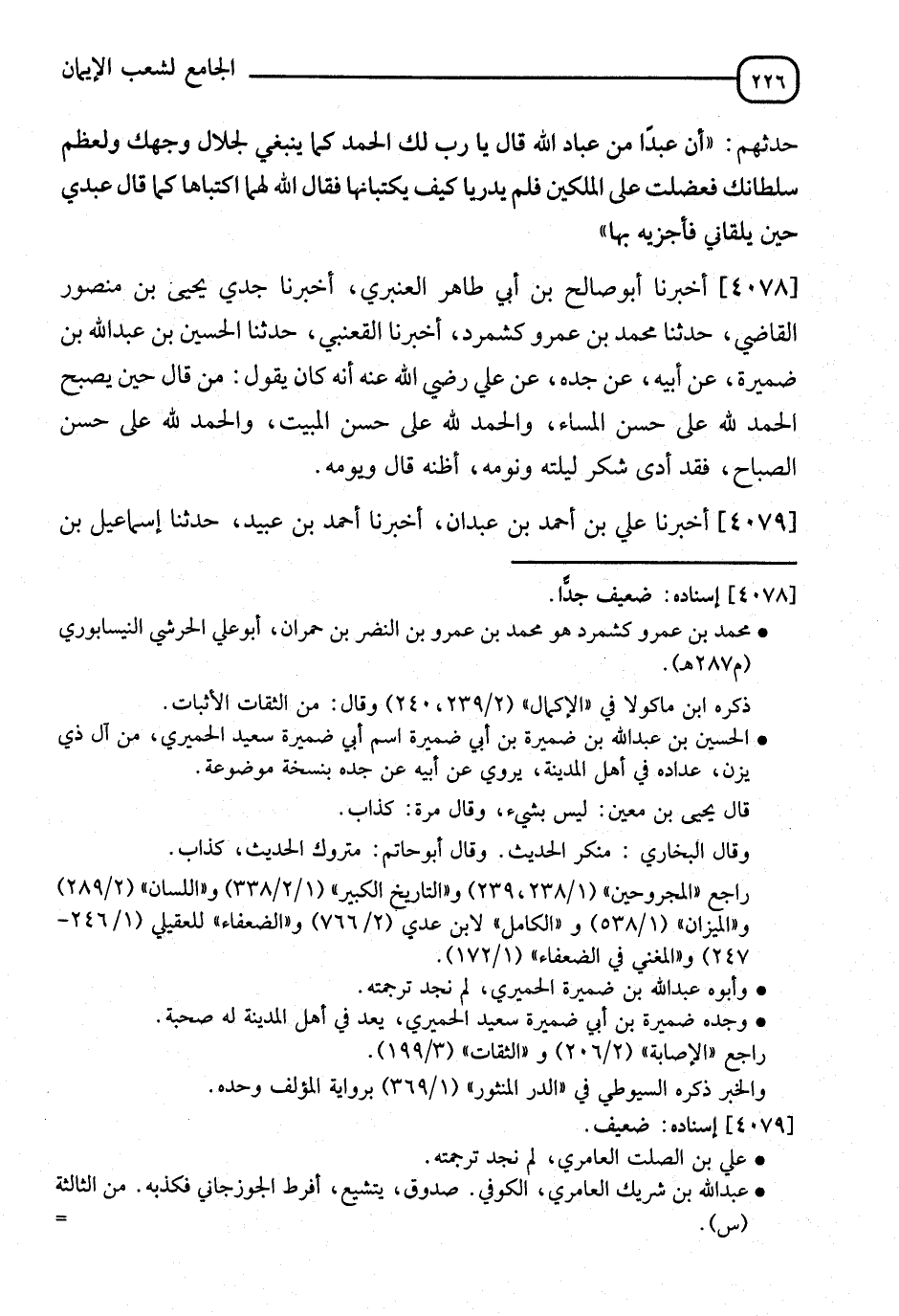 4079 - أَخْبَرَنَا عَلِيُّ بْنُ أَحْمَدَ بْنِ عَبْدَانَ، أَخْبَرَنَا أَحْمَدُ بْنُ عُبَيْدٍ، حَدَّثَنَا إِسْمَاعِيلُ بْنُ -[227]- الْفَضْلِ، حَدَّثَنَا مِنْجَابُ بْنُ الْحَارِثِ، حَدَّثَنَا عَلِيُّ بْنُ الصَّلْتِ الْعَامِرِيُّ، عَنْ عَبْدِ اللهِ بْنِ شُرَيْكٍ، عَنْ بِشْرِ بْنِ غَالِبٍ، أَوْ بَشِيرِ بْنِ غَالِبٍ - شَكَّ مِنْجَابٌ -، عَنْ عَلِيٍّ، أَنَّ النَّبِيَّ صَلَّى اللَّهُ عَلَيْهِ وَسَلَّمَ نَزَلَ عَلَيْهِ جِبْرِيلُ عَلَيْهِ السَّلَامُ، فَقَالَ: " يَا مُحَمَّدُ، §إِذْ سَرَّكَ أَنْ تَعْبُدَ اللهَ عَزَّ وَجَلَّ لَيْلَةً حَقَّ عِبَادَتِهِ، أَوْ يَوْمًا. فَقُلِ: اللهُمَّ لَكَ الْحَمْدُ حَمْدًا كَثِيرًا خَالِدًا مَعَ خُلُودِكَ، وَلَكَ الْحَمْدُ حَمْدًا لَا مُنْتَهَى لَهُ دُونَ عِلْمِكَ، وَلَكَ الْحَمْدُ حَمْدًا لَا مُنْتَهَى لَهُ دُونَ مَشِيئَتِكَ وَلَكَ الْحَمْدُ حَمْدًا لَا أَجْرَ لِقَائِلِهِِ إِلَّا رِضَاكَ ". قَالَ: الشَّيْخُ أَحْمَدُ: " لَمْ أَكْتُبْهُ إِلَّا هَكَذَا، وَفِيهِ انْقِطَاعٌ بَيْنَ عَلِيٍّ وَمَنْ دُونَهُ "