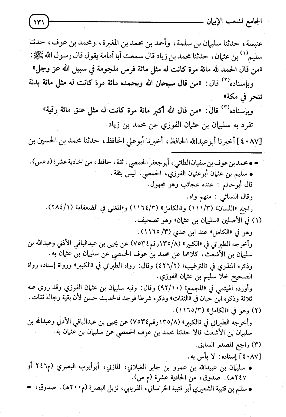 وَبِإِسْنَادِهِ، قَالَ: " §مَنْ قَالَ: سُبْحَانَ اللهِ وَبِحَمْدِهِ مِائَةَ مَرَّةٍ، كَانَتْ لَهُ مِثْلَ مِائَةِ بَدَنَةٍ تُنْحَرُ فِي مَكَّةَ "