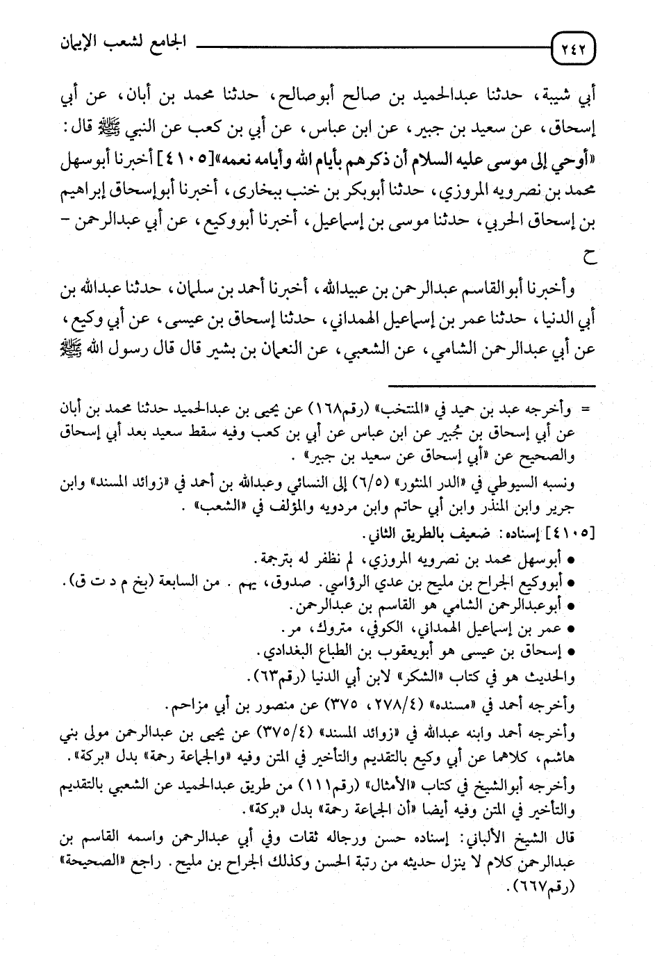 4105 - أَخْبَرَنَا أَبُو سَهْلٍ مُحَمَّدُ بْنُ نَصْرَوَيْهِ الْمَرْوَزِيُّ، حَدَّثَنَا أَبُو بَكْرِ بْنُ خَنْبٍ، بِبُخَارَى، أَخْبَرَنَا أَبُو إِسْحَاقَ إِبْرَاهِيمُ بْنُ إِسْحَاقَ الْحَربي، حَدَّثَنَا مُوسَى بْنُ إِسْمَاعِيلَ، أَخْبَرَنَا أَبُو وَكِيعٍ، عَنْ أَبِي عَبْدِ الرَّحْمَنِ، ح. وَأَخْبَرَنَا أَبُو الْقَاسِمِ عَبْدُ الرَّحْمَنِ بْنُ عُبَيْدِ اللهِ، أَخْبَرَنَا أَحْمَدُ بْنُ سَلْمَانَ، حَدَّثَنَا عَبْدُ اللهِ بْنُ أَبِي الدُّنْيَا، حَدَّثَنَا عُمَرُ بْنُ إِسْمَاعِيلَ الْهَمْدَانِيُّ، حَدَّثَنَا إِسْحَاقُ بْنُ عِيسَى، عَنْ أَبِي وَكِيعٍ، عَنْ أَبِي عَبْدِ الرَّحْمَنِ الشَّامِيِّ، عَنِ الشَّعْبِيِّ، عَنِ النُّعْمَانِ بْنِ بَشِيرٍ، قَالَ: قَالَ رَسُولُ اللهِ صَلَّى اللَّهُ عَلَيْهِ وَسَلَّمَ: -[243]- وَفِي رِوَايَةِ الْمَرْوَزِيِّ، عَنِ النَّبِيِّ صَلَّى اللَّهُ عَلَيْهِ وَسَلَّمَ، قَالَ: " §التَّحَدُّثُ بِنِعَمِ اللهِ شُكْرٌ، وَتَرْكُهَا كُفْرٌ، وَمَنْ لَا يَشْكُرِ الْقَلِيلَ لَا يَشْكُرِ الْكَثِيرَ ". زَادَ أَبُو الْقَاسِمِ فِي رِوَايَتِهِ: " وَمَنْ لَا يَشْكُرِ النَّاسَ لَا يَشْكُرِ اللهَ، وَالْجَمَاعَةُ بَرَكَةٌ وَالْفُرْقَةُ عَذَابٌ "