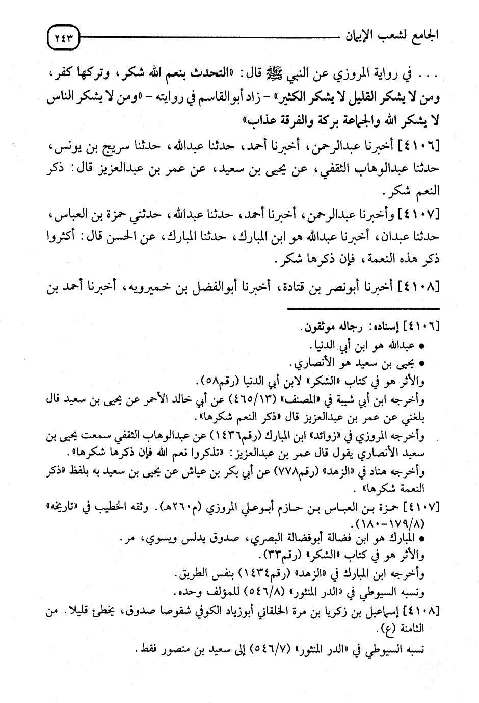 4108 - أَخْبَرَنَا أَبُو نَصْرِ بْنِ قَتَادَةَ، أَخْبَرَنَا أَبُو الْفَضْلِ بْنُ خُمَيْرَوَيْهِ، أَخْبَرَنَا أَحْمَدُ بْنُ -[244]- نَجْدَةَ، حَدَّثَنَا سَعِيدُ بْنُ مَنْصُورٍ، حَدَّثَنَا إِسْمَاعِيلُ بْنُ زَكَرِيَّا، عَنْ يَحْيَى بْنِ سَعِيدٍ، عَنْ عُمَرَ بْنِ عَبْدِ الْعَزِيزِ، قَالَ: §" ذِكْرُ النِّعَمِ شُكْرٌ "