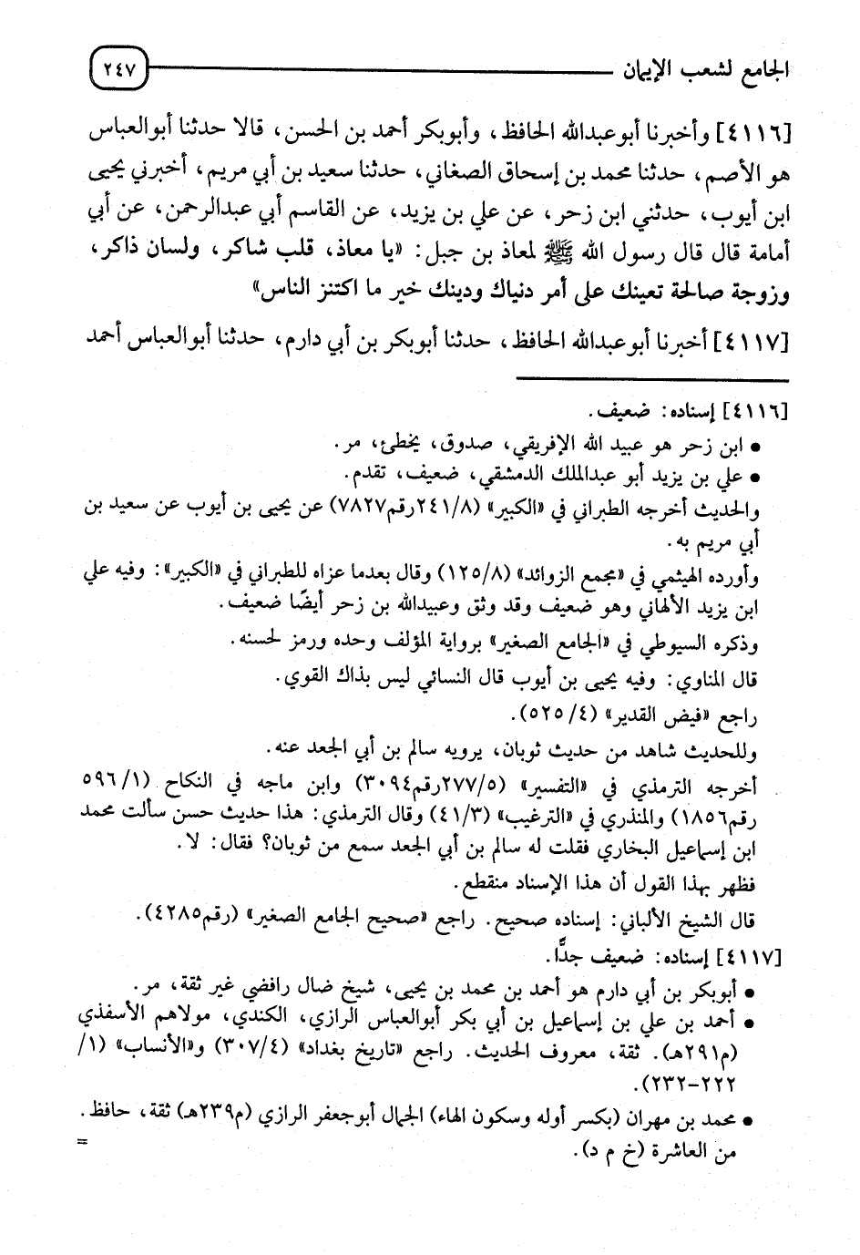 4116 - وَأَخْبَرَنَا أَبُو عَبْدِ اللهِ الْحَافِظُ، وَأَبُو بَكْرٍ أَحْمَدُ بْنُ الْحَسَنِ، قَالَا حَدَّثَنَا أَبُو الْعَبَّاسِ هُوَ الْأَصَمُّ، حَدَّثَنَا مُحَمَّدُ بْنُ إِسْحَاقَ الصَّغَانِيُّ، حَدَّثَنَا سَعِيدُ بْنُ أَبِي مَرْيَمَ، أَخْبَرَنِي يَحْيَى بْنُ أَيُّوبَ، حَدَّثَنِي ابْنُ زَحْرٍ، عَنْ عَلِيِّ بْنِ يَزِيدَ، عَنِ الْقَاسِمِ أَبِي عَبْدِ الرَّحْمَنِ، عَنْ أَبِي أُمَامَةَ، قَالَ: قَالَ رَسُولُ اللهِ صَلَّى اللَّهُ عَلَيْهِ وَسَلَّمَ لِمُعَاذِ بْنِ جَبَلٍ: " يَا مُعَاذُ، §قَلْبٌ شَاكِرٌ، وَلِسَانٌ ذَاكِرٌ، وَزَوْجَةٌ صَالِحَةٌ تُعِينُكَ عَلَى أَمْرِ دُنْيَاكَ، وَدِينِكَ خَيْرٌ، مَا اكْتَنَزَ النَّاسُ "