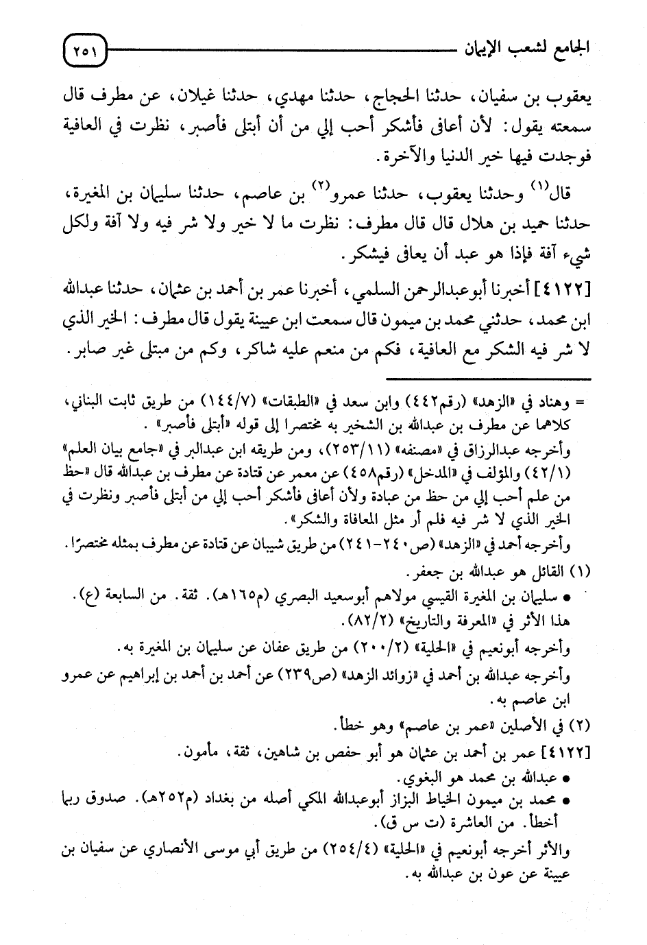 4122 - أَخْبَرَنَا أَبُو عَبْدِ الرَّحْمَنِ السُّلَمِيُّ، أَخْبَرَنَا عُمَرُ بْنُ أَحْمَدَ بْنِ عُثْمَانَ، حَدَّثَنَا عَبْدُ اللهِ بْنُ مُحَمَّدٍ، حَدَّثَنِي مُحَمَّدُ بْنُ مَيْمُونٍ، قَالَ: سَمِعْتُ ابْنَ عُيَيْنَةَ، يَقُولُ: قَالَ مُطَرِّفٌ: " §الْخَيْرُ الَّذِي لَا شَرَّ فِيهِ الشُّكْرُ مَعَ الْعَافِيَةِ، فَكَمْ مِنْ مُنْعَمٍ عَلَيْهِ شَاكِرٌ، وَكَمْ مِنْ مُبْتَلًى غَيْرِ صَابِرٍ "