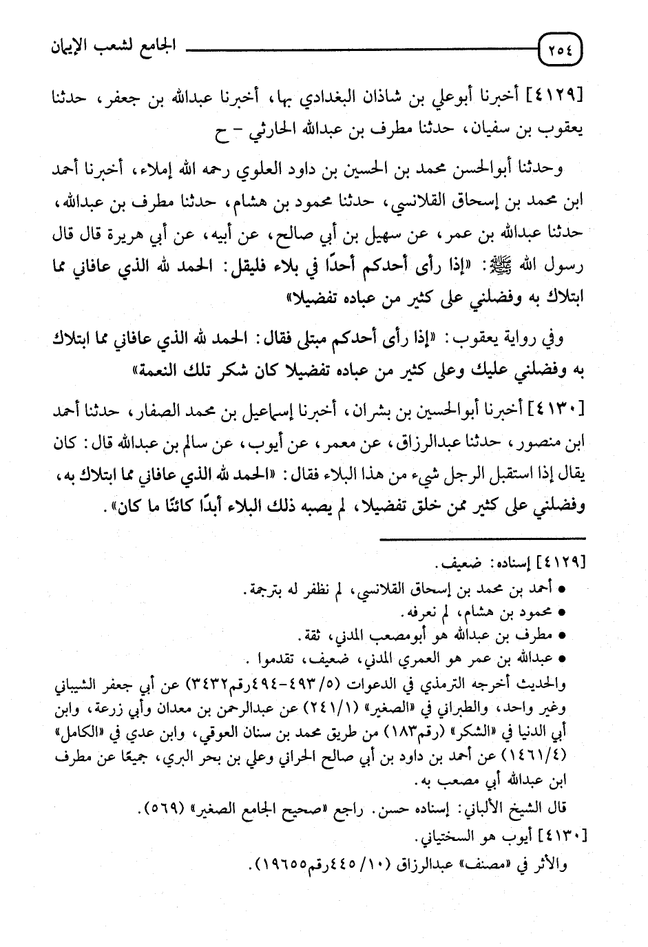 4129 - أَخْبَرَنَا أَبُو عَلِيِّ بْنُ شَاذَانَ الْبَغْدَادِيُّ بِهَا، أَخْبَرَنَا عَبْدُ اللهِ بْنُ جَعْفَرٍ، حَدَّثَنَا يَعْقُوبُ بْنُ سُفْيَانَ، حَدَّثَنَا مُطَرِّفُ بْنُ عَبْدِ اللهِ الْحَارِثِيُّ، ح وَحَدَّثَنَا أَبُو الْحَسَنِ مُحَمَّدُ بْنُ الْحُسَيْنِ بْنِ دَاوُدَ الْعَلَوِيُّ رَحِمَهُ اللهُ إِمْلَاءً، أَخْبَرَنَا أَحْمَدُ بْنُ مُحَمَّدِ بْنِ إِسْحَاقَ الْقَلَانِسِيُّ، حَدَّثَنَا مَحْمُودُ بْنُ هِشَامٍ، حَدَّثَنَا مُطَرِّفُ بْنُ عَبْدِ اللهِ، حَدَّثَنَا عَبْدُ اللهِ بْنُ عُمَرَ، عَنْ سُهَيْلِ بْنِ أَبِي صَالِحٍ، عَنْ أَبِيهِ، عَنْ أَبِي هُرَيْرَةَ، قَالَ: قَالَ رَسُولُ اللهِ صَلَّى اللَّهُ عَلَيْهِ وَسَلَّمَ: " §إِذَا رَأَى أَحَدُكُمْ أَحَدًا فِي بَلَاءٍ، فَلْيَقُلِ: الْحَمْدُ لِلَّهِ الَّذِي عَافَانِي مِمَّا ابْتَلَاك، به وَفَضَّلَنِي عَلَى كَثِيرٍ مِنْ عِبَادِهِ تَفْضِيلًا ". وَفِي رِوَايَةِ يَعْقُوبَ: " إِذَا رَأَى أَحَدُكُمْ مُبْتَلًى، فَقَالَ: الْحَمْدُ لِلَّهِ الَّذِي عَافَانِي مِمَّا ابْتَلَاكَ بِهِ، وَفَضَّلَنِي عَلَيْكَ وَعَلَى كَثِيرٍ مِنْ عِبَادِهِ تَفْضِيلًا كَانَ شَكَرَ تِلْكَ النِّعْمَةِ "