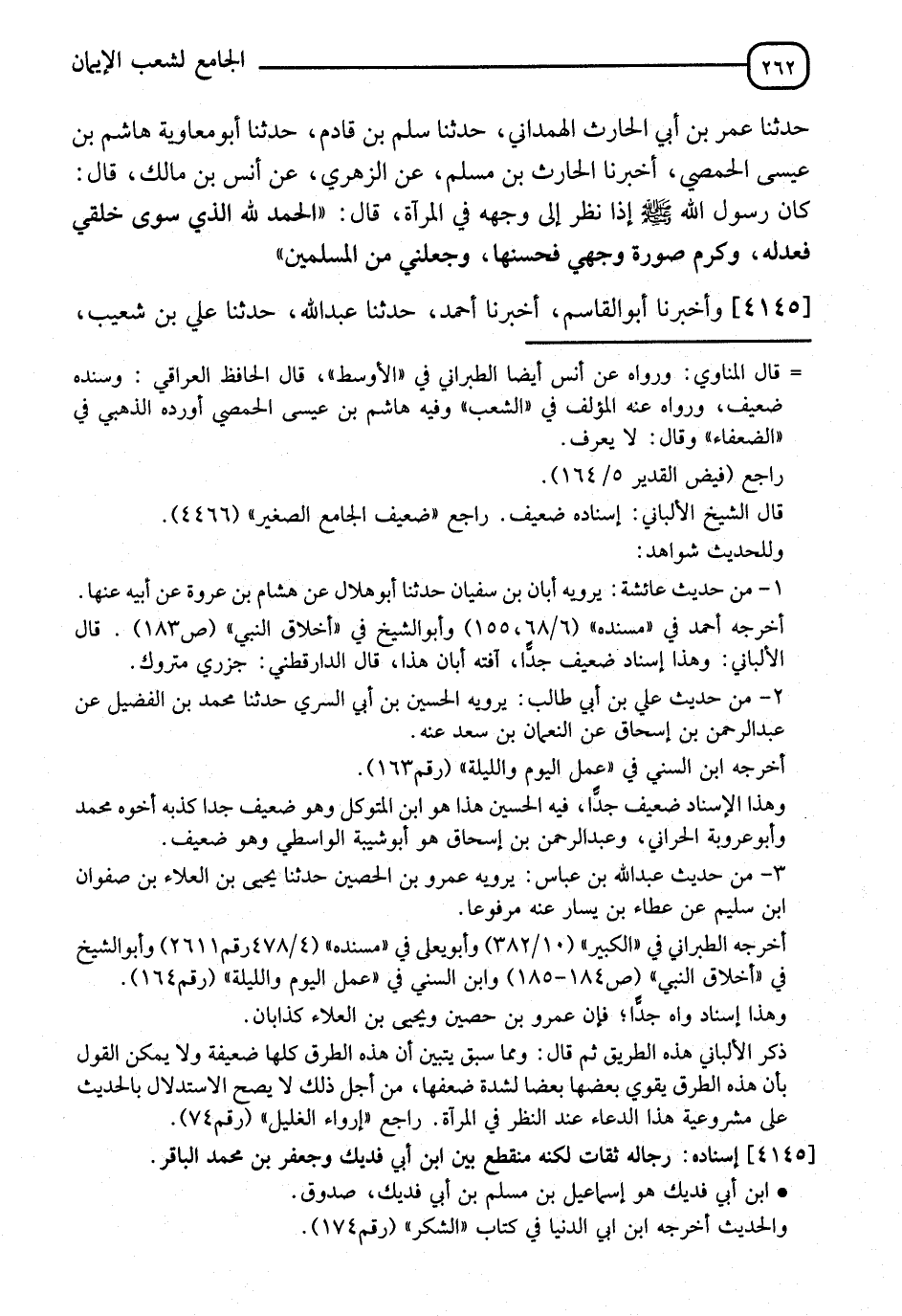 4145 - وَأَخْبَرَنَا أَبُو الْقَاسِمِ، أَخْبَرَنَا أَحْمَدُ، حَدَّثَنَا عَبْدُ اللهِ، حَدَّثَنَا عَلِيُّ بْنُ شُعَيْبٍ، -[263]- حَدَّثَنَا ابْنُ أَبِي فُدَيْكٍ، قَالَ: بَلَغَنِي، عَنْ جَعْفَرِ بْنِ مُحَمَّدٍ، عَنْ أَبِيهِ، قَالَ: كَانَ رَسُولُ اللهِ صَلَّى اللَّهُ عَلَيْهِ وَسَلَّمَ إِذَا نَظَرَ فِي الْمِرْآةِ، قَالَ: " §الْحَمْدُ لِلَّهِ الَّذِي حَسَّنَ خَلْقِي وَخُلُقِي، وَزَانَ مِنِّي مَا شَانٌ مِنْ غَيْرِي "
