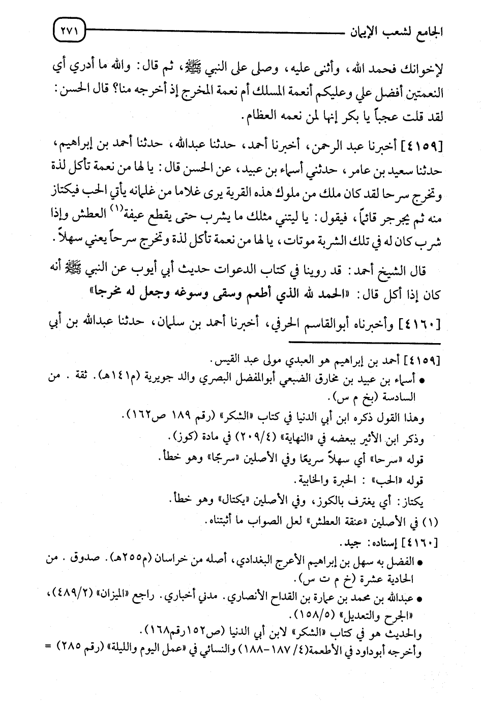 4159 - أَخْبَرَنَا عَبْدِ الرَّحْمَنِ، أَخْبَرَنَا أَحْمَدُ، حَدَّثَنَا عَبْدُ اللهِ، حَدَّثَنَا أَحْمَدُ بْنُ إِبْرَاهِيمَ، حَدَّثَنَا سَعِيدُ بْنُ عَامِرٍ، حَدَّثَنِي أَسْماءُ بْنُ عُبَيْدٍ، عَنِ الْحَسَنِ، قَالَ: " §يَا لَهَا مِنْ نِعْمَةٍ تَأْكُلُ لَذَّةً، وَتُخْرِجُ سَرْحًا لَقَدْ كَانَ مَلِكٌ مِنْ مُلُوكِ هَذِهِ الْقَرْيَةِ يَرَى غُلَامًا مِنْ غِلْمَانَهُ يَأْتِي الْحَبَّ فَيَكْتَازُ مِنْهُ، ثُمَّ يُجَرْجِرُ قَائِمًا، فَيَقُولُ: يَا لَيْتَنِي مِثْلُكَ مَا يَشْرَبُ حَتَّى يَقْطَعَ عُنُقَهُ الْعَطَشُ، وَإِذَا شَرِبَ كَانَ لَهُ فِي تِلْكَ الشَّرْبَةِ مَوْتَاتٍ يَا لَهَا مِنْ نِعْمَةٍ، تَأْكُلُ لُجَّةً، وَتُخْرِجُ سَرْحًا " - يَعْنِي سَهْلًا -