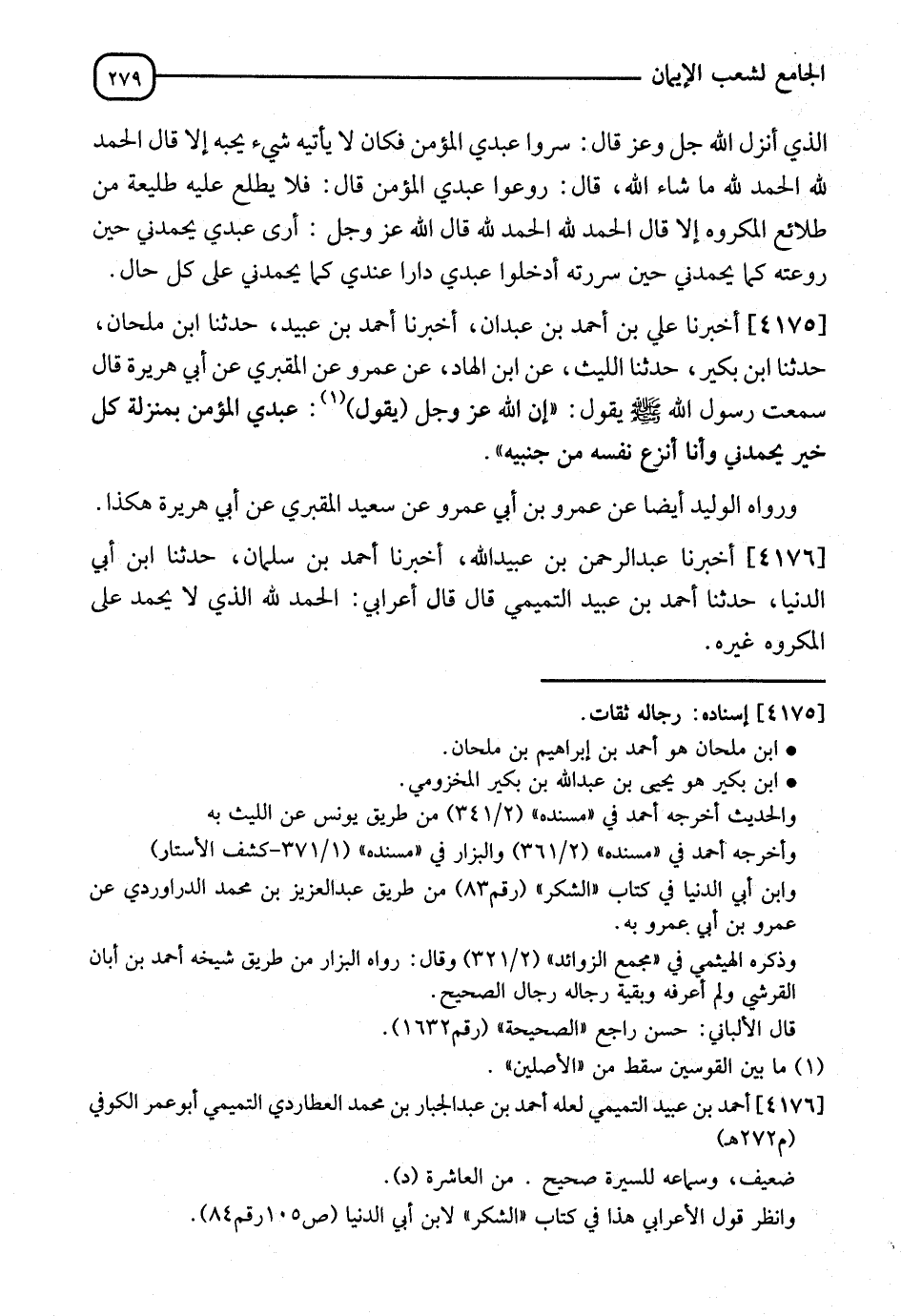 4175 - أَخْبَرَنَا عَلِيُّ بْنُ أَحْمَدَ بْنُ عَبْدَانَ، أَخْبَرَنَا أَحْمَدُ بْنُ عُبَيْدٍ، حَدَّثَنَا ابْنُ مِلْحَانَ، حَدَّثَنَا ابْنُ بُكَيْرٍ، حَدَّثَنَا اللَّيْثُ عَنِ ابْنِ الْهَادِ، عَنْ عَمْرٍو، عَنِ الْمَقْبُرِيِّ، عَنْ أَبِي هُرَيْرَةَ، قَالَ: سَمِعْتُ رَسُولَ اللهِ صَلَّى اللَّهُ عَلَيْهِ وَسَلَّمَ يَقُولُ: " إِنَّ اللهَ عَزَّ وَجَلَّ يَقُولُ: §عَبْدِي الْمُؤْمِنُ بِمَنْزِلَةِ كُلِّ خَيْرٍ يَحْمَدُنِي، وَأَنَا أَنْزِعُ نَفْسَهِ مِنْ بَيْنِ جَنْبَيْهِ ". وَرَوَاهُ الْوَلِيدُ أَيْضًا، عَنْ عَمْرِو بْنِ أَبِي عَمْرٍو، عَنْ سَعِيدٍ الْمَقْبُرِيِّ، عَنْ أَبِي هُرَيْرَةَ هَكَذَا