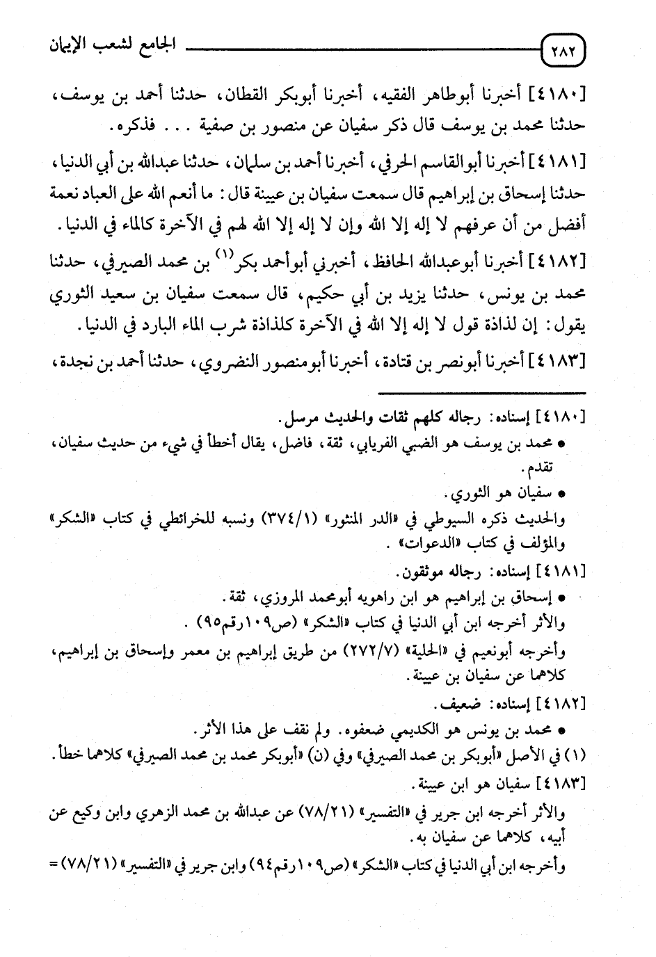 4182 - أَخْبَرَنَا أَبُو عَبْدِ اللهِ الْحَافِظُ، أَخْبَرَنِي أَبُو أَحْمَدَ بَكْرُ بْنُ مُحَمَّدٍ الصَّيْرَفِيُّ، حَدَّثَنَا مُحَمَّدُ بْنُ يُونُسُ، حَدَّثَنَا يَزِيدُ بْنُ أَبِي حَكِيمٍ، قَالَ: سَمِعْتُ سُفْيَانَ بْنَ سَعِيدٍ الثَّوْرِيَّ، يَقُولُ: " إِنَّ §لَذَاذَةَ قَوْلِ لَا إِلَهَ إِلَّا اللهُ فِي الْآخِرَةِ، كَلَذَاذَةِ شُرْبِ الْمَاءِ الْبَارِدِ فِي الدُّنْيَا "