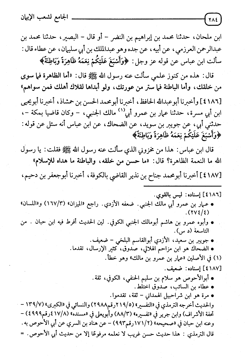 4186 - وَأَخْبَرَنَا أَبُو عَبْدِ اللهِ الْحَافِظُ، أَخْبَرَنَا أَبُو مُحَمَّدٍ الْحَسَنُ بْنُ حَمْشَاذَ، أخبرنا أَبُو يَحْيَى بْنُ أَبِي مَسَرَّةَ، حَدَّثَنَا عَمَّارُ بْنُ عَمْرِو أَبِي مَالِكٍ الْجَنْبِيُّ، وَكَانَ قَاضِيًا بِمَكَّةَ، حَدَّثَنِي أَبِي، عَنْ جُوَيْبِرِ بْنِ سَعِيدٍ، عَنِ الضَّحَّاكِ، عَنِ ابْنِ عَبَّاسٍ، أَنَّهُ سُئِلَ عَنْ قَوْلِهِ، {وَأَسْبَغَ عَلَيْكُمْ نِعَمَهُ ظَاهِرَةً وَبَاطِنَةً} [لقمان: 20]. قَالَ ابْنُ عَبَّاسٍ: هَذَا مِنْ مَخزُونِي الَّذِي سَأَلْتُ عَنْهُ رَسُولَ اللهِ صَلَّى اللَّهُ عَلَيْهِ وَسَلَّمَ، فَقُلْتُ: يَا رَسُولُ اللهِ §مَا النِّعْمَةُ الظَّاهِرَةُ؟ قَالَ: " مَا حَسَّنَ مِنْ خَلْقِهِ، وَالْبَاطِنَةُ مَا هَدَاهُ لِلْإِسْلَامِ "