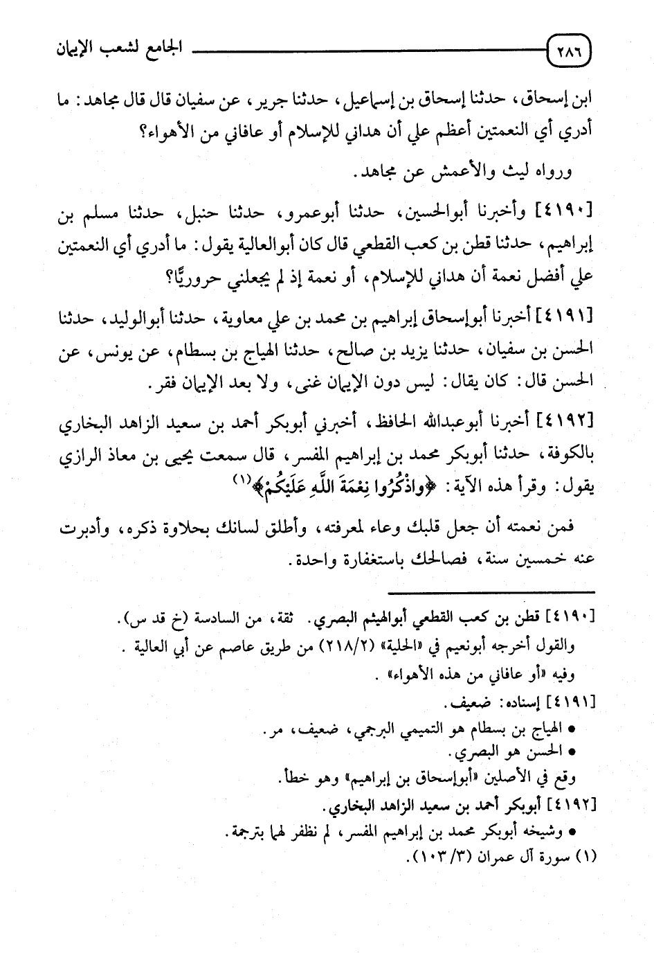 4192 - أَخْبَرَنَا أَبُو عَبْدِ اللهِ الْحَافِظُ، أَخْبَرَنِي أَبُو بَكْرِ أَحْمَدَ بْنُ سَعِيدٍ الزَّاهِدُ الْبُخَارِيُّ، بِالْكُوفَةِ، حَدَّثَنَا أَبُو بَكْرٍ مُحَمَّدُ بْنُ إِبْرَاهِيمَ الْمُفَسِّرُ، قَالَ: سَمِعْتُ يَحْيَى بْنَ مُعَاذٍ الرَّازِيَّ، يَقُولُ: وَقَرَأَ هَذِهِ الْآيَةَ {واذْكُرُوا نِعْمَةَ اللهِ عَلَيْكُمْ} [آل عمران: 103] " §فَمِنْ نِعْمَتِهِ أَنْ جَعَلَ قَلْبَكَ وِعَاءً لِمَعْرِفَتِهِ، وَأَطْلَقَ لِسَانَكَ بِحَلَاوَةِ ذِكْرِهِ، وَأَدْبَرْتَ عَنْهُ خَمْسِينَ سَنَةً فَصَالَحَكَ بِاسْتِغْفَارَةٍ وَاحِدةٍ "
