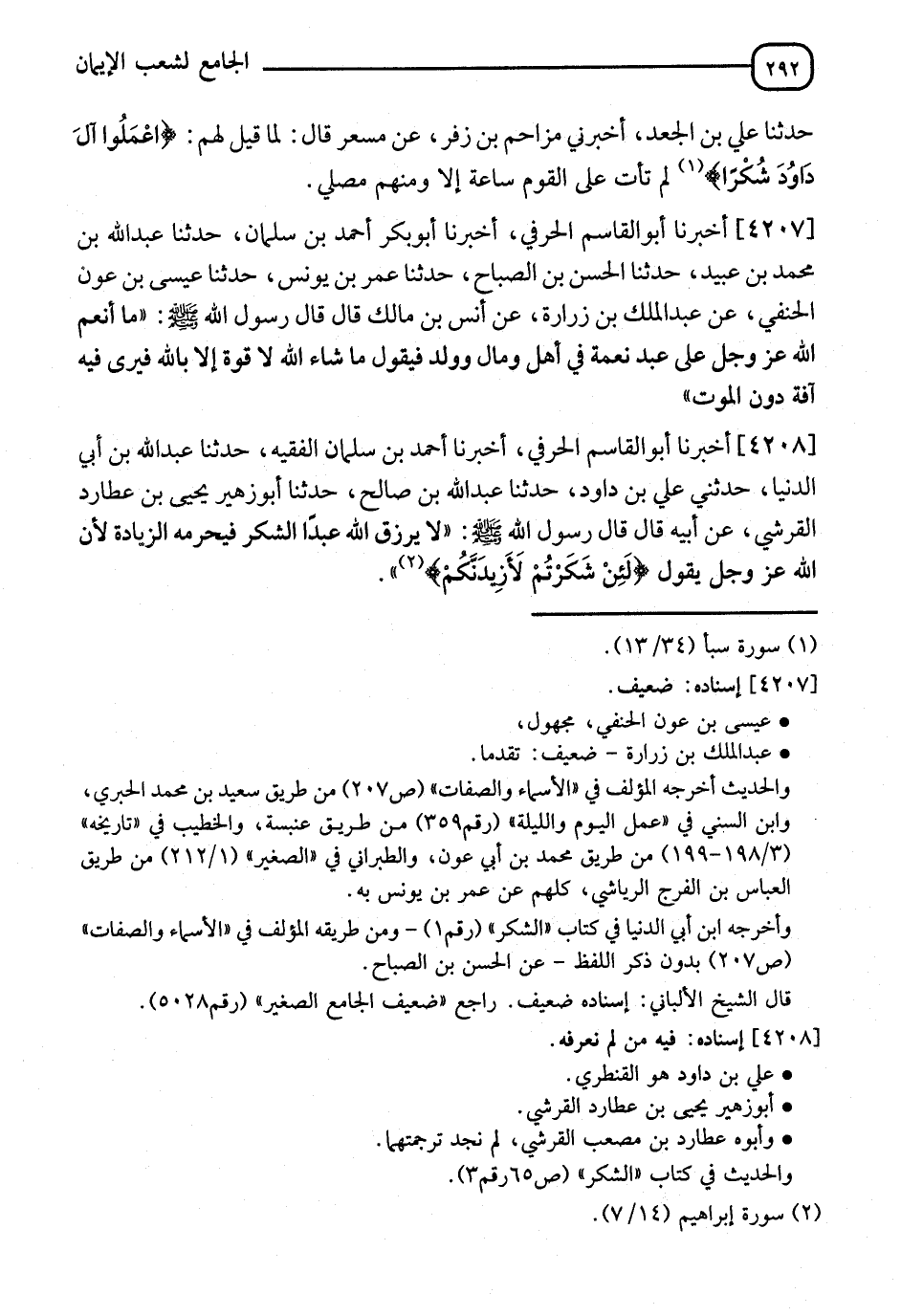 4208 - أَخْبَرَنَا أَبُو الْقَاسِمِ الْحرفِيُّ، أَخْبَرَنَا أَحْمَدُ بْنُ سَلْمَانَ الْفَقِيهُ، حَدَّثَنَا عَبْدُ اللهِ بْنُ أَبِي الدُّنْيَا، حَدَّثَنِي عَلِيُّ بْنُ دَاوُدَ، حَدَّثَنَا عَبْدُ اللهِ بْنُ صَالِحٍ، حَدَّثَنَا أَبُو زُهَيْرٍ يَحْيَى بْنُ عُطَارِدٍ الْقُرَشِيُّ، عَنْ أَبِيهِ، قَالَ: قَالَ رَسُولُ اللهِ صَلَّى اللَّهُ عَلَيْهِ وَسَلَّمَ: §" لَا يَرْزُقُ اللهُ عَبْدًا الشُّكْرَ فَيَحْرَمَهُ الزِّيَادَةَ لَأَنِ اللهَ عَزَّ وَجَلَّ يَقُولُ: {لَئِنْ شَكَرْتُمْ لَأَزِيدَنَّكُمْ} [إبراهيم: 7] "