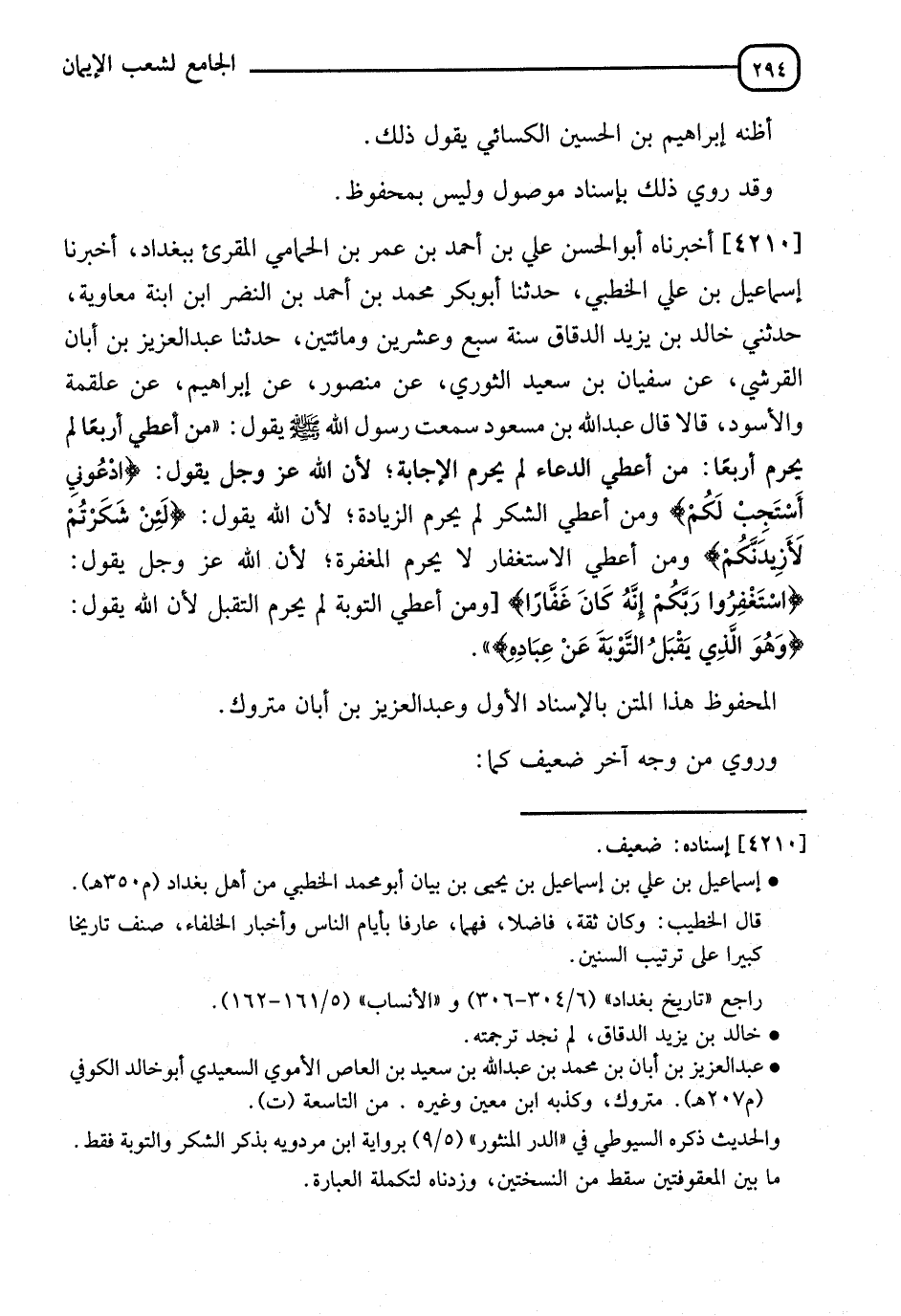 4210 - أَخْبَرَنَاهُ أَبُو الْحَسَنِ عَلِيُّ بْنُ أَحْمَدَ بْنِ عُمَرَ بْنِ الْحَمَامِيُّ الْمُقْرِئُ بِبَغْدَادَ، أَخْبَرَنَا إِسْمَاعِيلُ بْنُ عَلِيٍّ الْخُطَبِيُّ، حدثنا أَبُو بَكْرٍ مُحَمَّدُ بْنُ أَحْمَدَ بْنِ النَّضْرِ ابْنِ بْنَتِ مُعَاوِيَةَ، حَدَّثَنِي خَالِدُ بْنُ يَزِيدَ الدَّقَّاقُ، سَنَةَ سَبْعٍ وَعِشْرِينَ وَمِائَتَيْنِ، حَدَّثَنَا عَبْدُ الْعَزِيزِ بْنُ أَبَانٍ الْقُرَشِيُّ، عَنْ سُفْيَانَ بْنِ سَعِيدٍ الثَّوْرِيِّ، عَنْ مَنْصُورٍ، عَنْ إِبْرَاهِيمَ، عَنْ عَلْقَمَةَ، وَالْأَسْوَدِ، قَالَا: قَالَ عَبْدُ اللهِ بْنُ مَسْعُودٍ، سَمِعْتُ رَسُولَ اللهِ صَلَّى اللَّهُ عَلَيْهِ وَسَلَّمَ يَقُولُ: " §مَنْ أُعْطِيَ أَرْبَعًا لَمْ يُحَرَمْ أَرْبَعًا، مَنْ أُعْطِيَ الدُّعَاءَ لَمْ يُحَرَمِ الْإِجَابَةَ؛ لِأَنَّ اللهَ عَزَّ وَجَلَّ يَقُولُ {ادْعُونِي أَسْتَجِبْ لَكُمْ} [غافر: 60]، وَمَنْ أُعْطِيَ الشُّكْرَ لَمْ يُحَرَمِ الزِّيَادَةَ لِأَنَّ اللهَ يَقُولُ: {لَئِنْ شَكَرْتُمْ لَأَزِيدَنَّكُمْ} [إبراهيم: 7]، وَمَنْ أُعْطِيَ الِاسْتِغْفَارَ لَا يُحَرَمُ الْمَغْفِرَةَ، لِأَنَّ اللهَ عَزَّ وَجَلَّ يَقُولُ: {اسْتَغْفِرُوا رَبَّكُمْ إِنَّهُ كَانَ غَفَّارًا} [نوح: 10] وَمَنْ أُعْطِيَ التَّوْبَةَ لَمْ يُحْرَمِ التَّقَبُّلَ لِأَنَّ اللهَ يَقُولُ: {وَهُوَ الَّذِي يَقْبَلُ التَّوْبَةَ عَنْ عِبَادِهِ} [الشورى: 25] ". " الْمَحْفُوظُ هَذَا الْمَتْنُ بِالِإِسْنَادِ الْأَوَّلِ وَعَبْدُ الْعَزِيزِ بْنُ أَبَانَ مَتْرُوكٌ، وَرُوِيَ مِنْ وَجْهٍ آخِرَ ضَعِيفٍ "