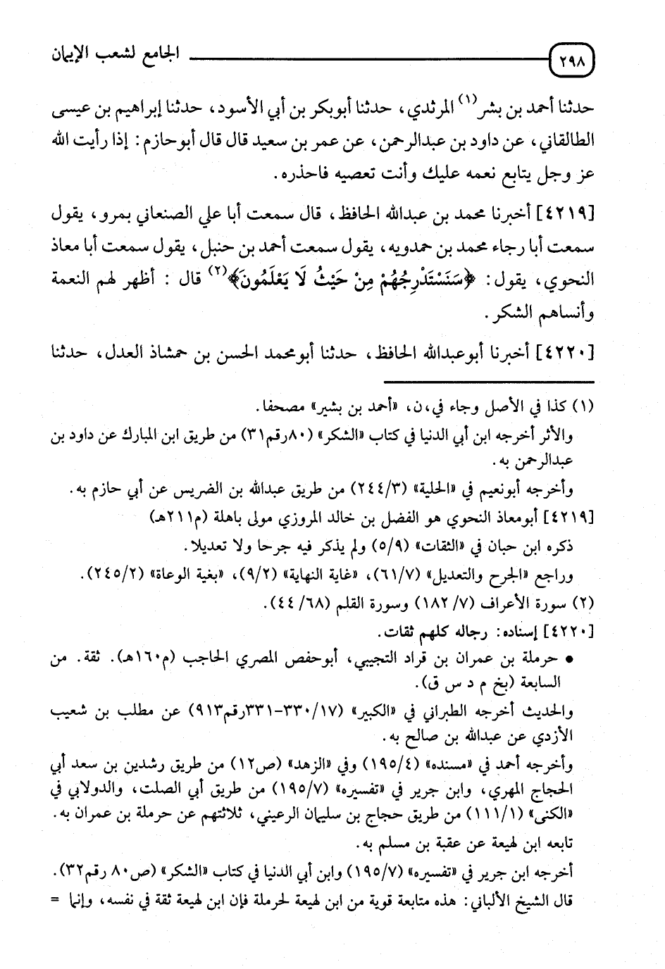4219 - أَخْبَرَنَا مُحَمَّدُ بْنُ عَبْدِ اللهِ الْحَافِظُ، قَالَ: سَمِعْتُ أَبَا عَلِيٍّ الصَّنْعَانِيَّ، بِمَرْوٍ، يَقُولُ: سَمِعْتُ أَبَا رَجَاءٍ مُحَمَّدَ بْنَ حَمْدَوَيْهِ، يَقُولُ: سَمِعْتُ أَحْمَدَ بْنَ حَنْبَلٍ، يَقُولُ: سَمِعْتُ أَبَا مُعَاذٍ النَّحْوِيَّ، يَقُولُ: {سَنَسْتَدْرِجُهُمْ مِنْ حَيْثُ لَا يَعْلَمُونَ} [الأعراف: 182]، قَالَ: " §أُظْهِرُ لَهُمُ النِّعْمَةَ، وَأُنْسِيهُمُ الشُّكْرَ "